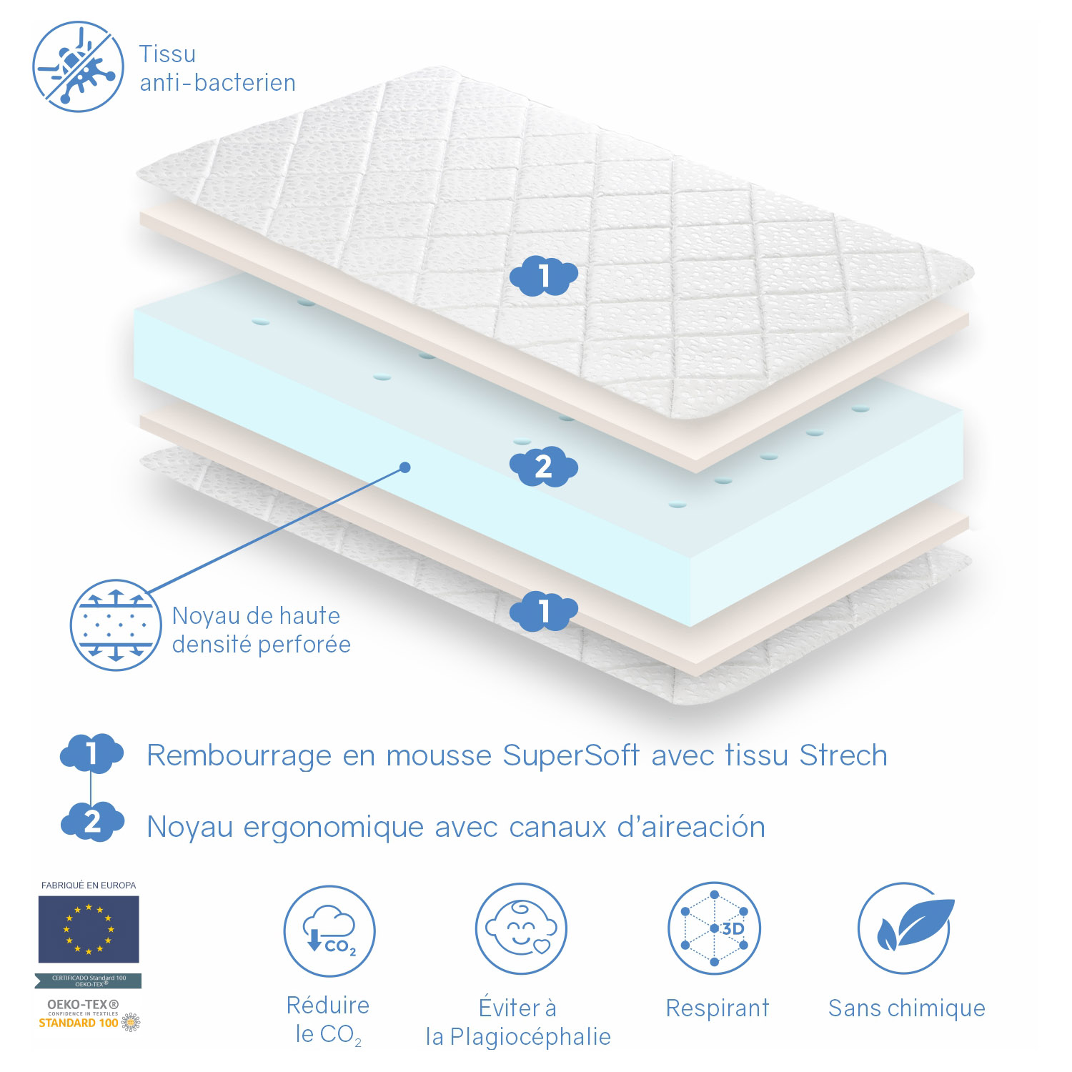 Le matelas est conçu pour s'adapter aux besoins et à la morphologie de votre bébé, soulageant la pression sur les vaisseaux sanguins et sur la tête (réduisant le risque de plagiocéphalie)