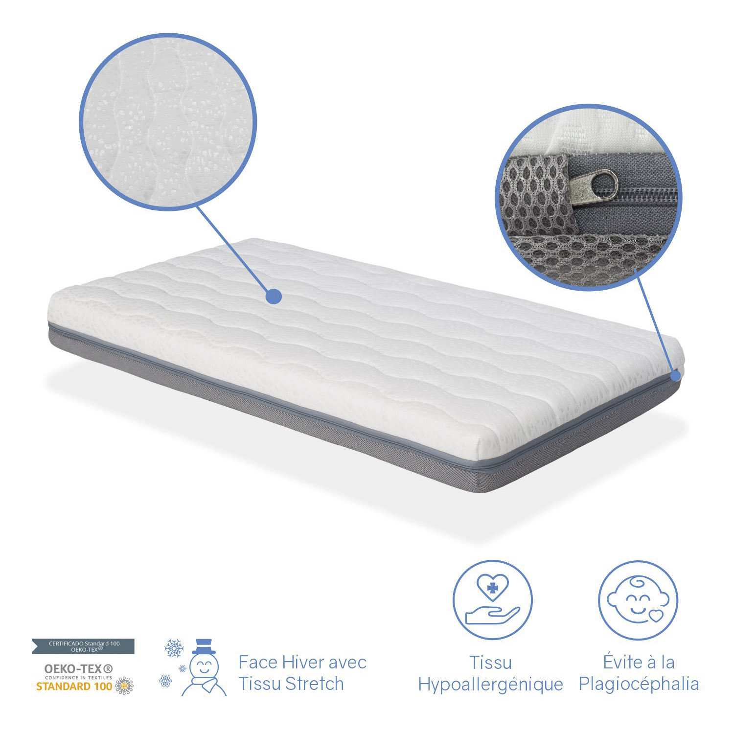 Matelas bébé KALA 60X120 + plan incliné 15° - Epaisseur 11cm – Déhoussable et lavable