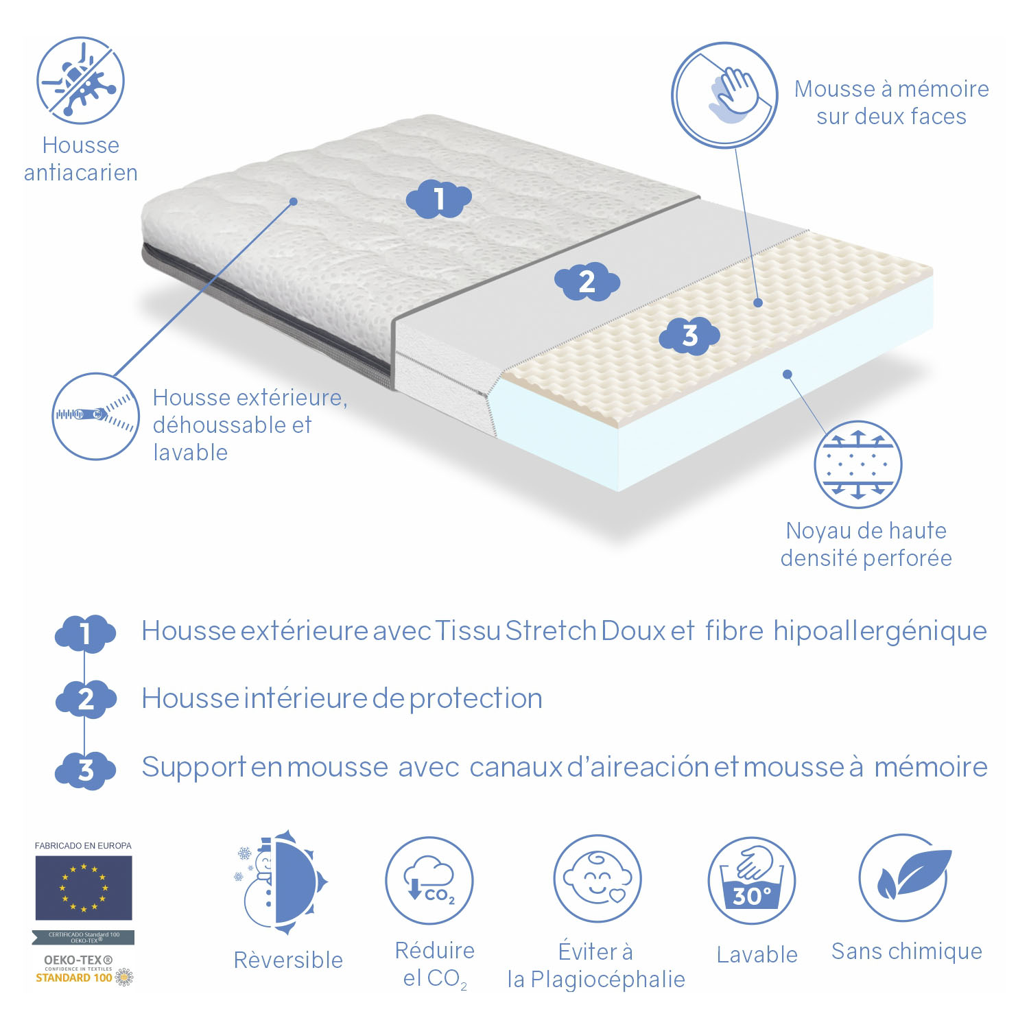 Le repos sur notre bébé pendant la première étape de sa vie est primordial pour l’aider à grandir en bonne santé. C'est pourquoi Dormalit créé le matelas de lit Kala spécialement conçu pour répondre aux besoins du bébé. C’est un matelas qui combine les avantages de la mousse à mémoire avec de la mousse de haute qualité pour offrir le meilleur confort ergonomique et prévenir la plagiocéphalie. Noyau Le noyau est formé de mousse à mémoire sur les deux faces du matelas et de mousse haute densité perforée pour éliminer la chaleur et l’humidité. La mousse à mémoire aide à adapter le corps de notre bébé sur le matelas et soulager les points de pression pendant son sommeil. Grâce à la mousse perforée, il est possible de créer des canaux d’aération pour éviter la formation de poches de CO2 et l’anti-étouffement. Mousse à mémoire Mousse perforée.Respirant Évite à la plagiocéphalie Rembourrage Matelas déhoussable. La housse extérieure est faite de tissu Stretch doux et élastique sur la face supérieure. .La face inférieure est formée de tissu 3D hautement respirant qui contribue à réduire la chaleur et l’accumulation de CO2. En outre, il dispose d’une housse intérieure en tissu de protection multi-élastique qui facilite le retrait de la housse. Avec une fermeture à glissière en forme de L garantit un retrait rapide et efficace de la housse. Le curseur de la fermeture à glissière est conservé dans une poche en tissu. Housse lavable. Nous prenons soin de tous les détails. Réversible déhoussable lavable Dimensions Ce matelas a une hauteur de 11 cm. Il pèse environ 2,9 kg et est fabriqué avec des composants sûrs et non nocifs pour la santé de notre bébé. L’âge recommandé est de 0 à 24 mois. Ce matelas de lit de bébé est parfaitement valide pour être utilisé dès la naissance à la transition vers le lit. Points forts Ce matelas a été fabriqué à faible impact environnemental et sous les normes de qualité les plus élevées qui garantissent la fabrication sans substances nocives.