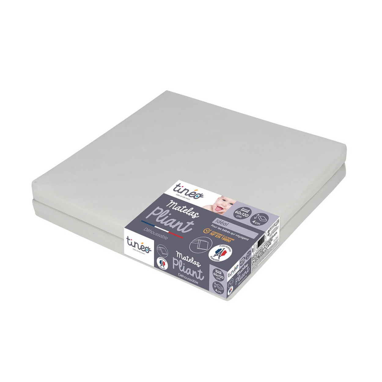Comme bébé passe beaucoup de temps à dormir les premières années et que son sommeil est essentiel à son développement, Tinéo porte une attention particulière à la mise au point de ses matelas.Le matelas pliant en deux parties 60x120cm imaginé par Tinéo permet à bébé de dormir confortablement même lorsqu'il est en sortie. Facilement transportable et peu encombrant grâce à son système de pliage en 2 volets. Son garnissage en fibres de polyester permet un accueil moelleux à bébé pour des siestes complètes. Son épaisseur de 4cm et sa densité de fibre 900g/m3 donne davantage de confort à bébé.Matelas déhoussable.Pour la sécurité de bébé, la languette de la fermeture éclaire a été retirée du matelas volontairement lors de sa fabrication. Pour ouvrir et fermer le housse, vous pouvez insérer un trombone par exemple dans le curseur de la fermeture éclair. N'oubliez pas de retirer l'objet utilisé une fois que le matelas est mis en place dans le lit de bébé.Le matelas pliant de Tinéo est sans traitement, il est conforme à la norme NF EN 16890.Ce matelas est fabriqué en France.Découvrir tous les matelas bébé pliants