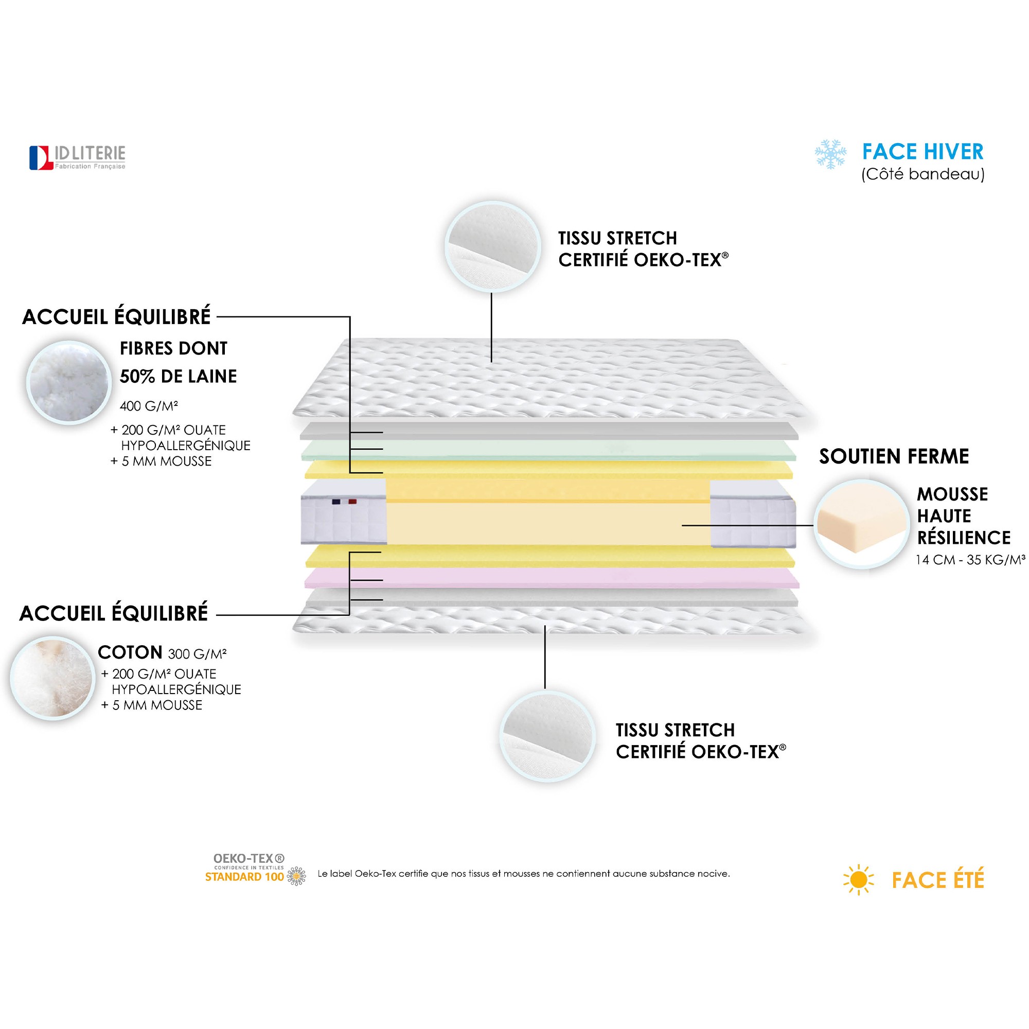 Ame : 14 cm de mousse 100 % polyuréthane haute résilience densité 35 kg/m3 (durable, souple et rigide à la fois ; une des meilleurs du marché)