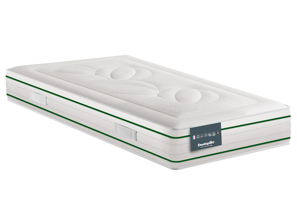 - Matelas Dunlopillo Genius - Gen7 :- Technologie : 100% latex naturel perforé - Densité : brute 90 kg/m3 brute - nette 70 kg/m3- Hauteur âme : 14cm- Hauteur totale : 22cm- Zones : 7 zones de confort- Double face de couchage : oui- Face hiver : Coton + fibres hypoallergéniques (300gr/m2) + mousse de confort (17mm)- Face été : Lin, soie, cachemire + fibres hypoallergéniques (300gr/m2) + mousse de confort (17mm)- Composition coutil : stretch 100% polyester- Traitement coutil : hypoallergénique- Garantie 5 ans (étendue à 7 ans en achetant le sommier Dunlopillo)- Fabriqué en France