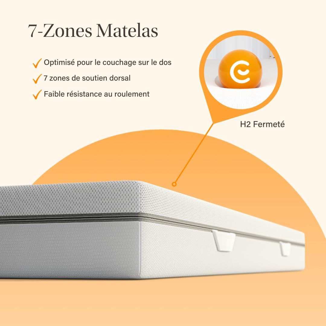 Conçu pour mieux dormir & booster vos journées! Leader du matelas en France, Emma veut offrir à chacun la chance de bien dormir pour mieux profiter de la vie. C´est possible avec ce matelas Emma One de 18 cm! Spécialement conçu pour convenir à toutes les morphologies, les 7 zones de soutien permettent un alignement parfait de la colonne vertebrale pour un confort optimal. Caracteristiques du matelas Emma One : Matelas entiérement déhoussable composé de 3 couches de mousses. - la mousse Airgocell® à pores ouverts assure une excellente respirabilité - la mousse Visco adaptative permet de soulager les points de pression - Mousse de soutien profilée apporte un soutien adapté aux différentes zones du corps et un alignement parfait de la colonne vertébrale - Autorégulation de la température et respirabilité grâce aux fibres climatiques de la housse - Housse hautement élastique, lavable en machine jusqu’à 40°C Emma : la marque de matelas vue à la Télé. Garantie : 10 ans