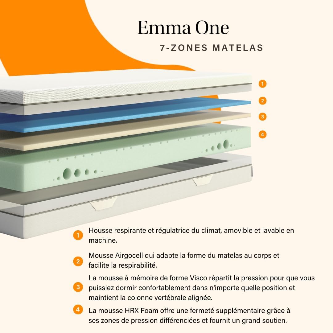 Conçu pour mieux dormir & booster vos journées! Leader du matelas en France, Emma veut offrir à chacun la chance de bien dormir pour mieux profiter de la vie. C´est possible avec ce matelas Emma One de 18 cm! Spécialement conçu pour convenir à toutes les morphologies, les 7 zones de soutien permettent un alignement parfait de la colonne vertebrale pour un confort optimal. Caracteristiques du matelas Emma One : Matelas entiérement déhoussable composé de 3 couches de mousses. - la mousse Airgocell® à pores ouverts assure une excellente respirabilité - la mousse Visco adaptative permet de soulager les points de pression - Mousse de soutien profilée apporte un soutien adapté aux différentes zones du corps et un alignement parfait de la colonne vertébrale - Autorégulation de la température et respirabilité grâce aux fibres climatiques de la housse - Housse hautement élastique, lavable en machine jusqu’à 40°C Emma : la marque de matelas vue à la Télé. Garantie : 10 ans