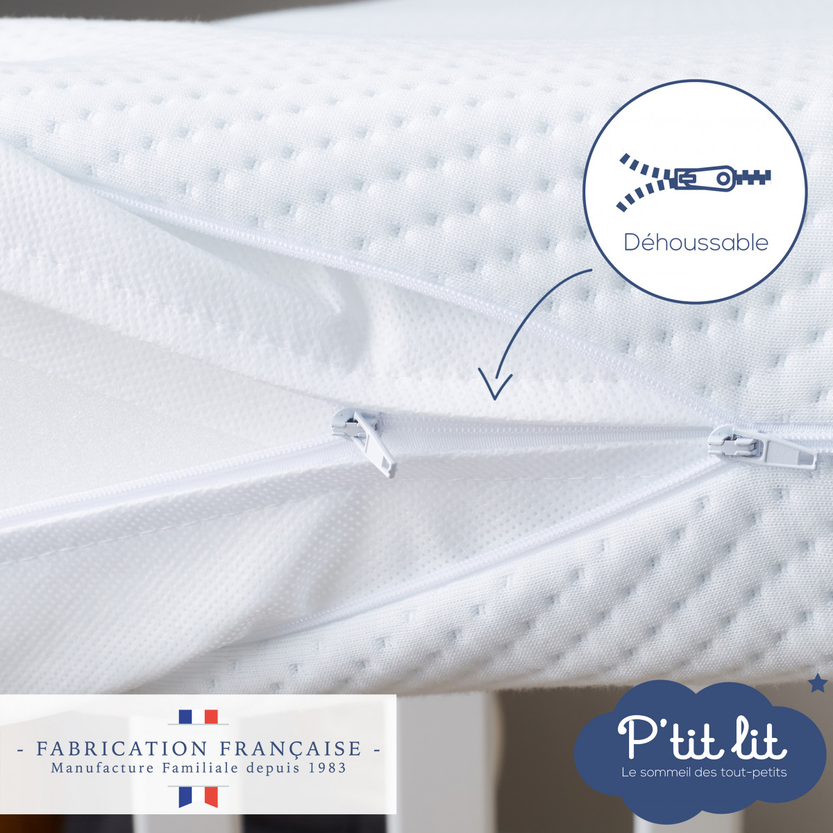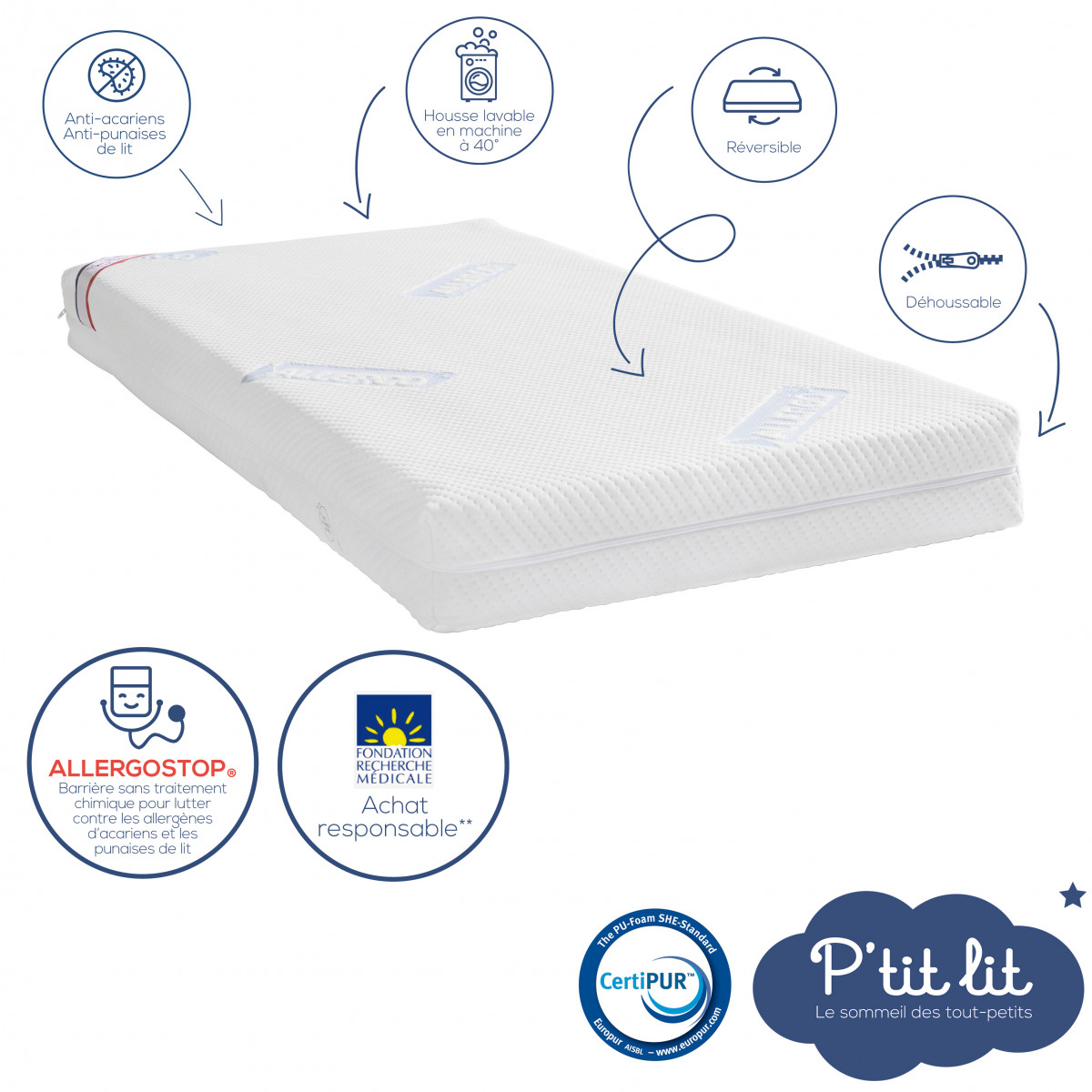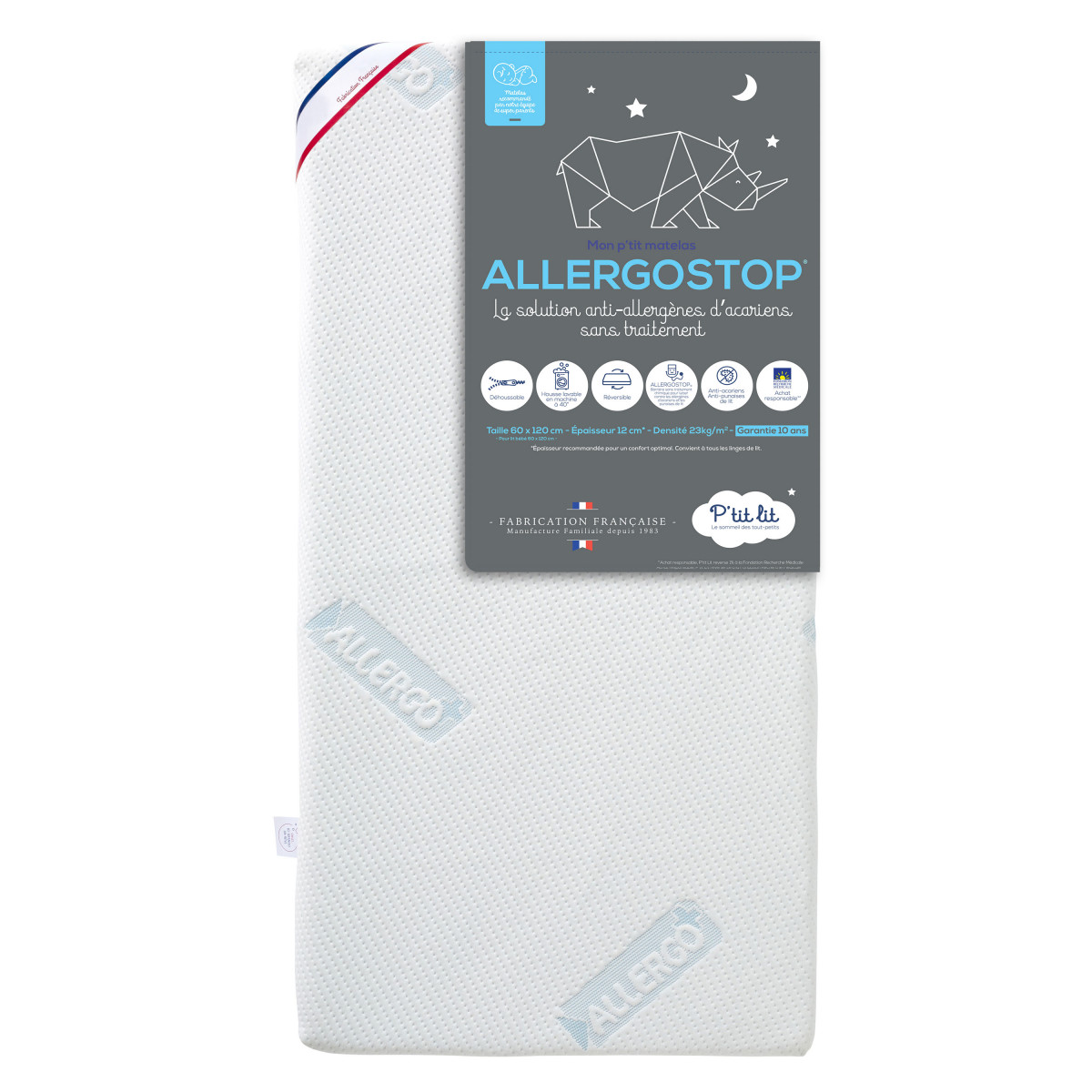 Matelas conseillé pour tous les enfants souffrant d'allergies, d'asthme ou d'eczéma, le p'tit ALLERGOSTOP sera votre meilleur allié pour aider bébé à retrouver un sommeil plus sain et sans aucun traitement chimique.