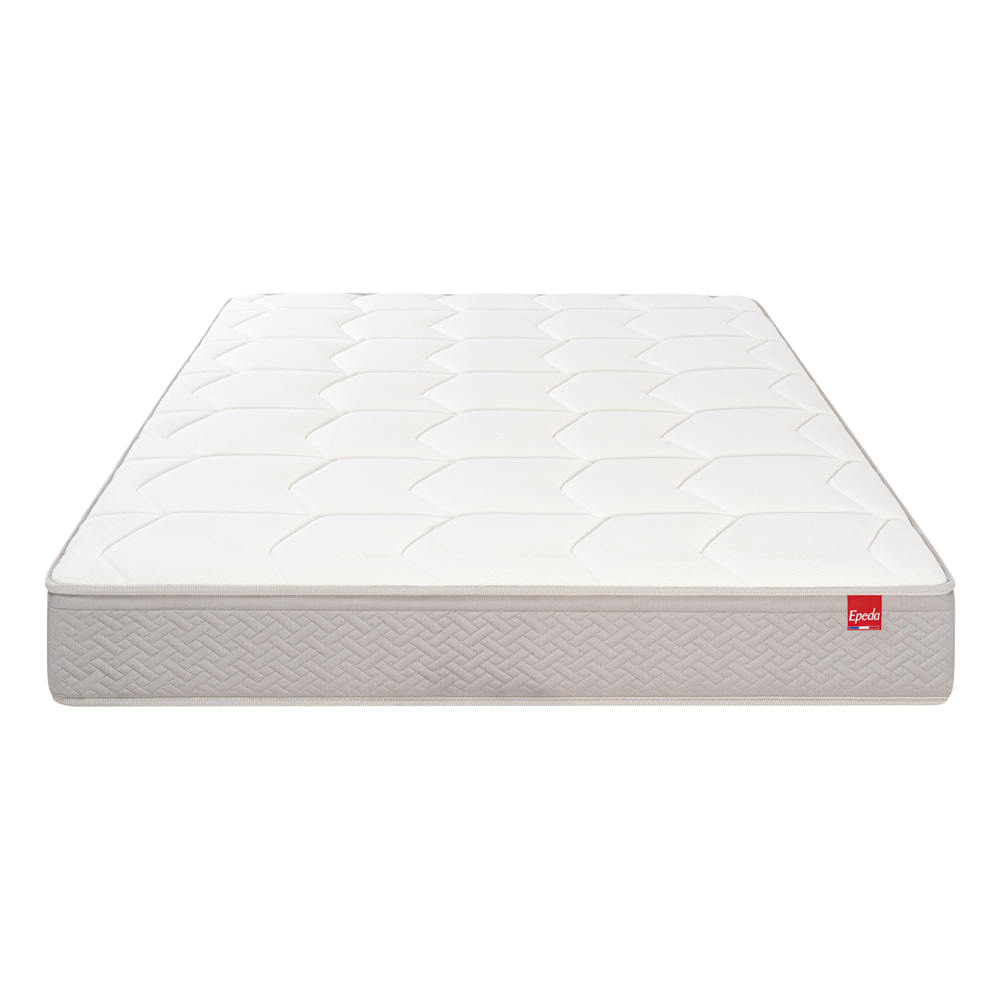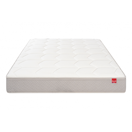 -Matelas Epeda Destination : - Technologie : Suspension ressorts ensachés (580 pour la dimension 140x190cm) constitué à 90% d'acier recyclé et 10% non recyclé. - Ventilation : excellente- Zones : non- indépendance de couchage : excellente- Ceinture de mousse stabilisatrice- Hauteur totale : 23 cm- Double face de couchage : oui- Face hiver : mousse à mémoire de forme (10mm, 42 kg/m³) + mousse "Soft" (18mm, 18 kg/m³) + fibres hypoallergéniques (150 g/m², 80 % recyclées, 20 % non recyclées)- Face été : mousse "Soft" (18mm, 18 kg/m³) + fibres hypoallergéniques (150 g/m², 80 % recyclées, 20 % non recyclées)- Nature du garnissage du matelas: synthétique- Poignée(s) : oui- Composition coutil : 100% polyester- Traitement coutil : non - sans traitement Biocide - Certifié OEKO-TEX Standard 100- Certifié NF Environnement - Livré roulé et compressé : non- Fabriqué en France- Garantie 5 ans matelas seul - 7 ans avec le sommier de la même marque