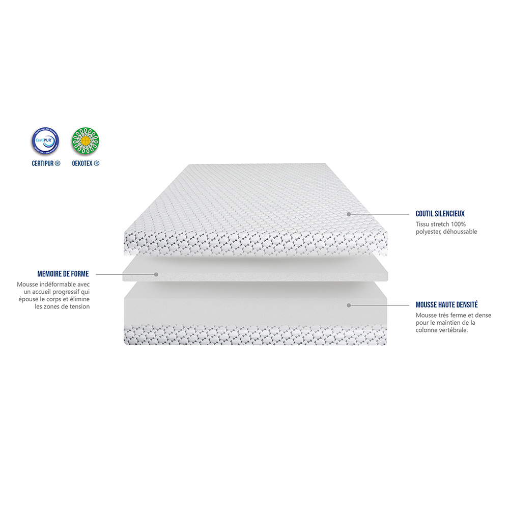 | Garnissage | Âme intérieure du matelas (certifiée CertiPUR) : 18 cm de mousse Haute Densité de 28 kg/m³ + 3 cm de mousse à mémoire de forme de 50 kg/m³ Housse amovible (labellisée Oeko-Tex) : Tissu stretch 100% polyester |