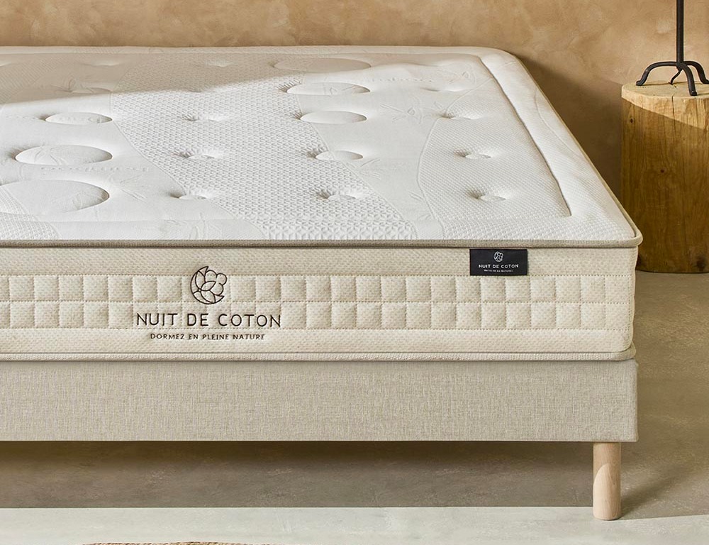 - Coutil (labellisé Oeko-Tex) : FACE A Tissu stretch bambou de 350 gr/m² - Garnissage 400 gr/m² de laine + 2 cm de mousse supersoft / FACE B Tissu Spacer 40% coton de 250 gr/m² - Garnissage 400 gr/m² de lin + 2 cm de mousse supersoft