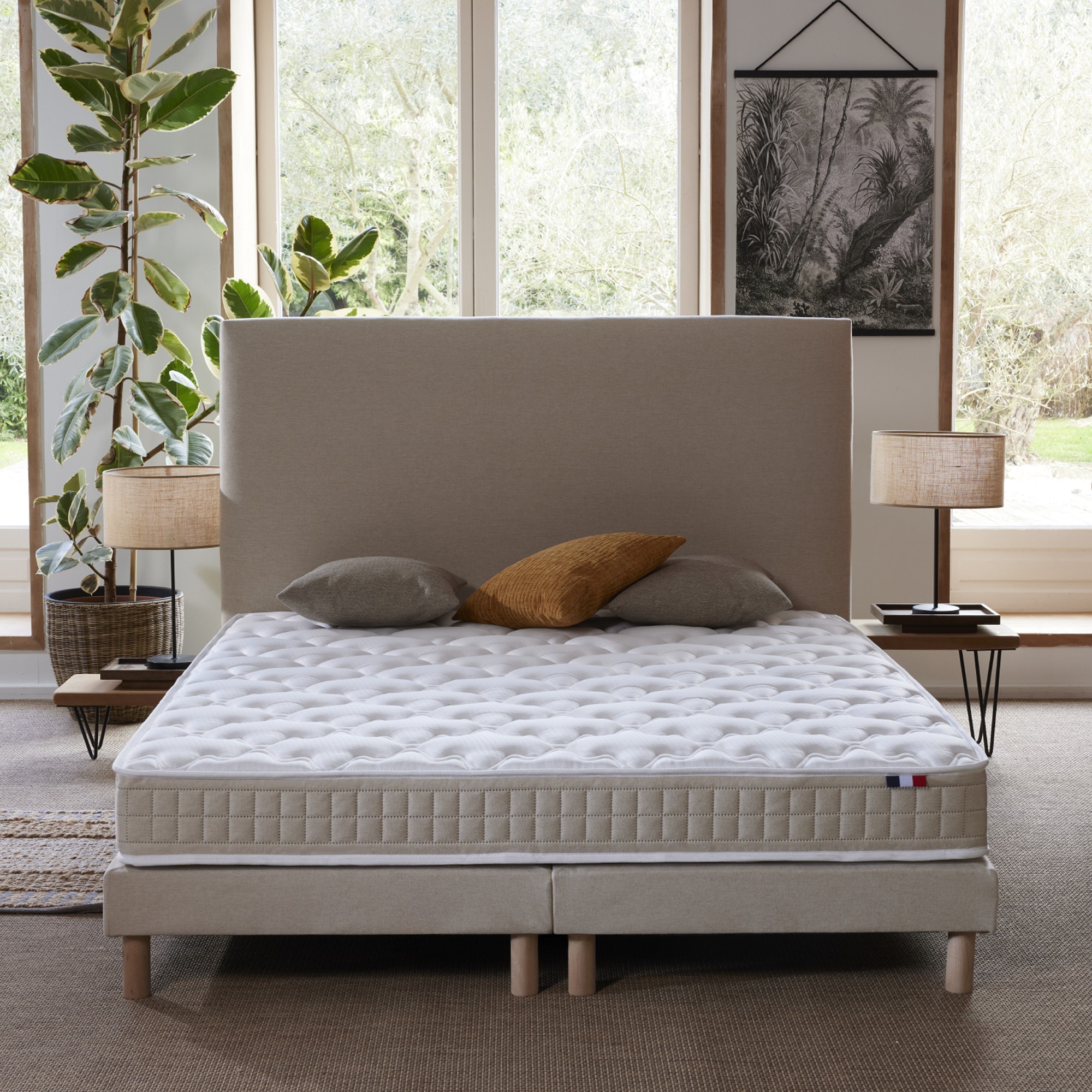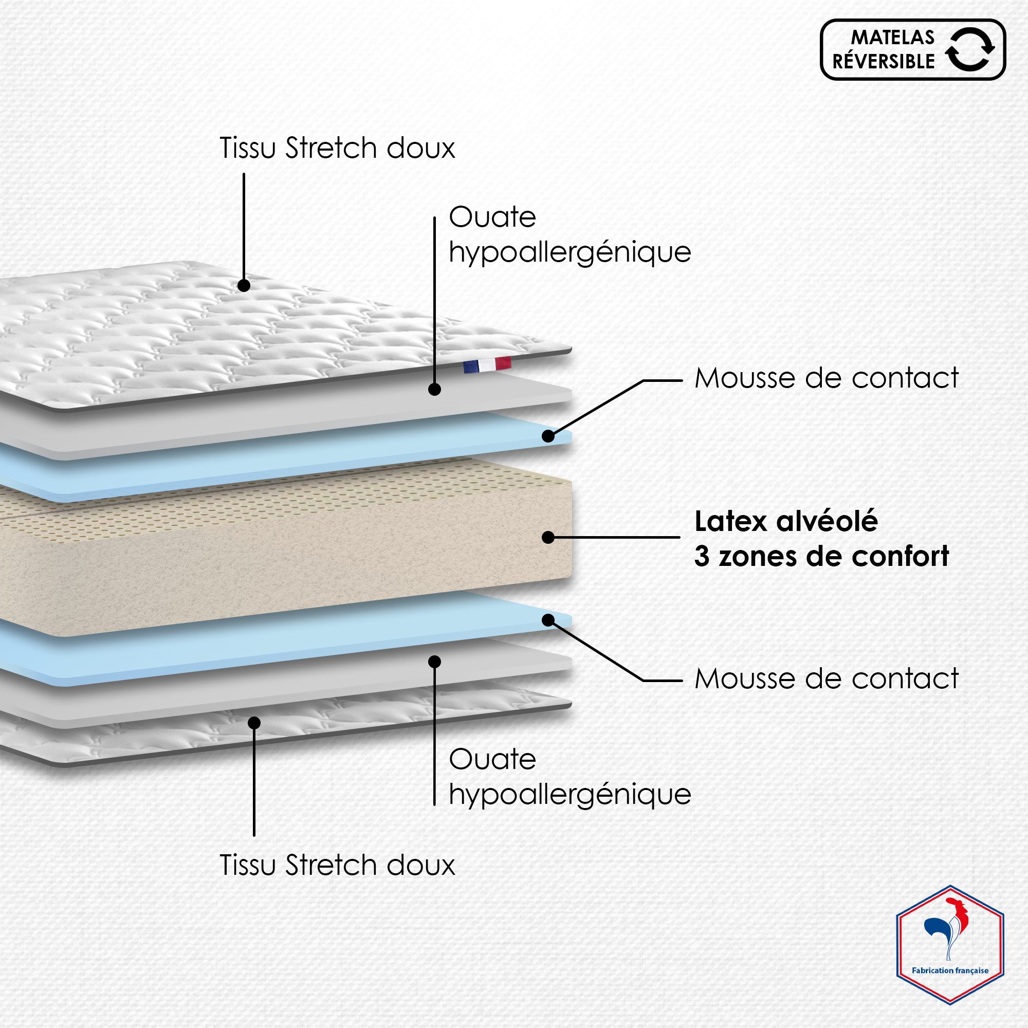 Matelas latex 3 zones - Un confort adapté pour des nuits paisibles Le Matelas latex 3 zones est conçu pour répondre à vos besoins essentiels en matière de sommeil. Alliant confort et qualité, il offre un soutien équilibré pour des nuits apaisantes. Grâce à sa fabrication en France et à sa composition en latex, ce matelas est idéal pour ceux qui recherchent un couchage fiable et durable. Un design pensé pour le confort Avec une épaisseur de 18 cm, ce matelas propose un accueil moelleux et un soutien ferme, parfait pour maintenir un bon alignement du corps. Son âme est constituée de 14 cm de latex alvéolé d'une densité de 78 kg/m³, garantissant une excellente aération et un soutien optimal. Les 3 zones de confort différenciées permettent un soutien précis pour la tête, le dos et les jambes, favorisant un sommeil réparateur. Adapté aux saisons Le matelas est équipé de deux faces distinctes pour répondre à vos besoins tout au long de l'année : Face hiver : Enrichie de 4.5 mm de mousse, 200 g/m2 de ouate hypoallergénique, pour un confort chaleureux. Face été : Composée de 4.5 mm de mousse, 200 g/m2 de ouate hypoallergénique pour une sensation bien-être. Des matériaux de qualité Le latex utilisé, issu de la sève d'hévéa, est reconnu pour sa durabilité et son confort. Il est naturellement aéré, permettant une régulation efficace de la chaleur et de l'humidité. Le coutil stretch 100 % polyester, doux au toucher, apporte un confort supplémentaire tout en étant traité pour garantir une hygiène impeccable : anti-acariens, antibactérien et hypoallergénique. Un entretien facile Pour préserver les qualités de votre matelas, pensez à le retourner tous les 6 mois et à inverser la tête et les pieds tous les 3 mois. L'ajout d'un protège-matelas et d'un drap-housse prolongera également sa durée de vie tout en assurant une hygiène optimale. Fabriqué en France avec une garantie de 5 ans Ce matelas, fabriqué avec soin en France, est conçu pour durer. Avec une garantie de 5 ans, il incarne la fiabilité et le confort à un prix abordable. Le Matelas 100% latex 3 zones est une solution idéale pour ceux qui recherchent un sommeil de qualité tout au long de l'année.