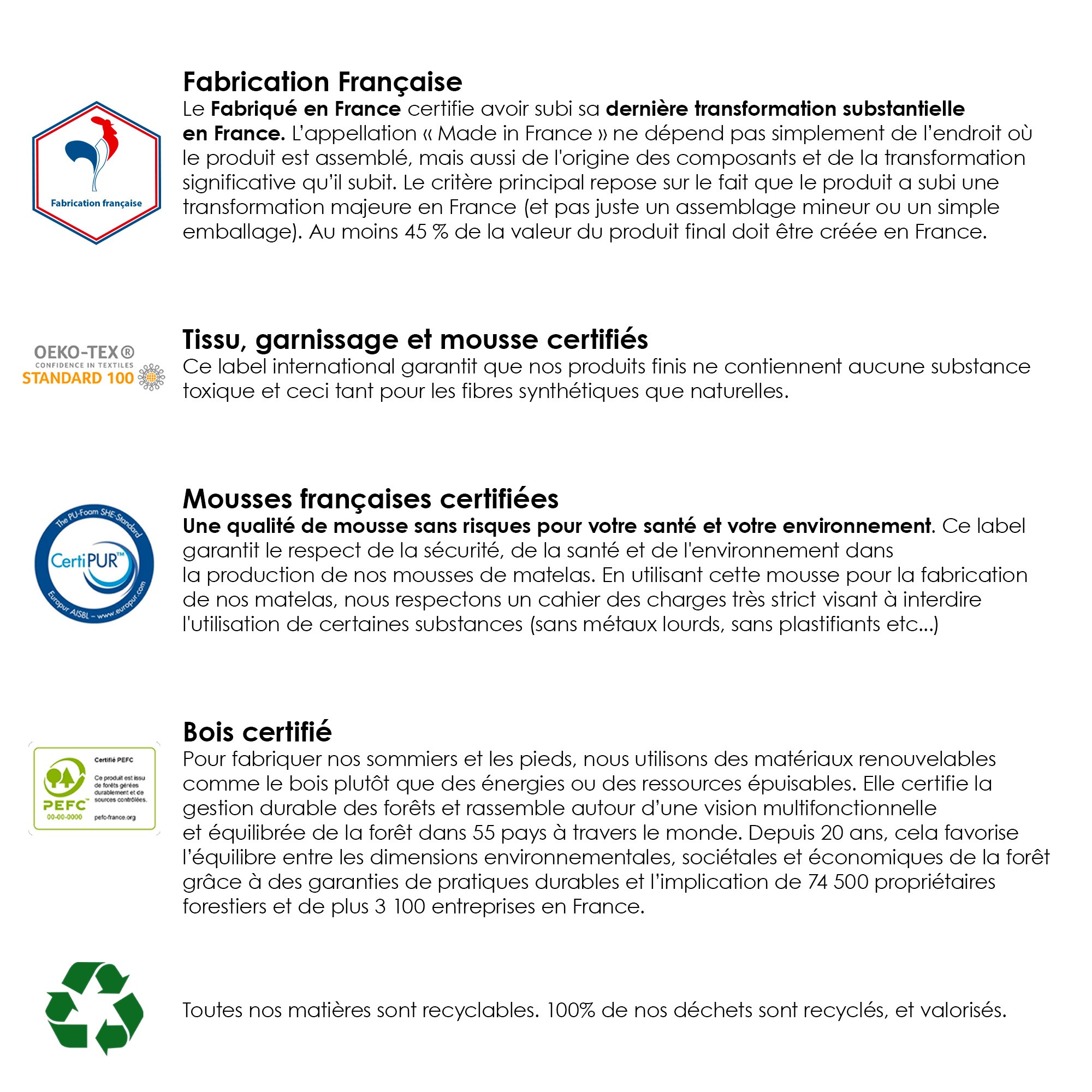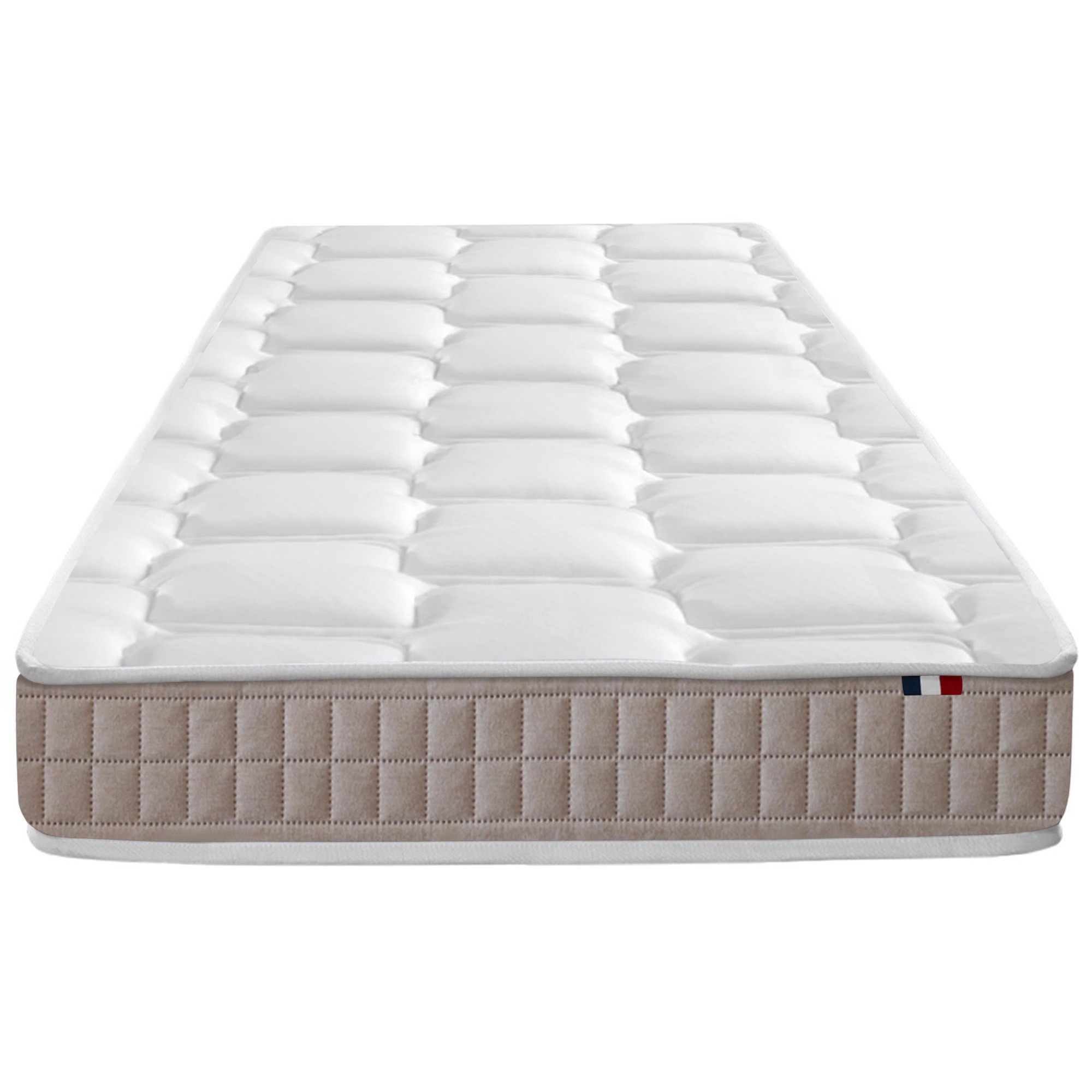 Matelas latex alvéolé 5 zones ? Un équilibre parfait pour des nuits paisibles Imaginez chaque nuit comme un moment de détente absolue, où votre corps trouve le soutien parfait pour se reposer et se régénérer. Avec le matelas latex alvéolé 5 zones, profitez d'un confort équilibré conçu pour s'adapter à vos besoins. Fabriqué avec soin en France, ce matelas est une invitation à des nuits paisibles et réparatrices, grâce à une technologie pensée pour durer. Un soutien ergonomique grâce aux 5 zones différenciées Ce matelas combine un accueil moelleux et un soutien ferme pour s'adapter à votre morphologie. Son âme en latex alvéolé, à la densité de 85 kg/m³, offre un confort optimal et une parfaite indépendance de couchage. Les 5 zones différenciées ? tête, épaules, lombaires, jambes, pieds ? apportent un soutien précis à chaque partie de votre corps, favorisant une relaxation totale et un alignement idéal. Ce matelas fait 18 cm d'épaisseur Un matelas pour toutes les saisons Grâce à ses deux faces, ce matelas s'adapte aux variations climatiques : Face hiver : Enrichie de 200 g de fibre avec 50 % de laine, elle conserve la chaleur pour des nuits douillettes. Face été : Composée de 300 g de coton, cette face assure un confort pendant les périodes plus chaudes. Des matériaux fiables et respectueux Le latex, fabriqué à partir de la sève d'hévéa, est l'un des matériaux les plus aérés et résistants. Il régule naturellement la chaleur et l'humidité pour un confort constant. Le coutil stretch 100 % polyester, traité contre les acariens et hypoallergénique, garantit une hygiène irréprochable. Tissu certifié Oeko-Tex. Facile à entretenir et durable Pour prolonger sa durée de vie, retournez votre matelas tous les 6 mois et inversez la tête et les pieds tous les 3 mois. Associez-le à un protège-matelas pour une protection optimale. Un choix durable et accessible Fabriqué en France et garanti 5 ans, le matelas 100% latex alvéolé 5 zones allie confort, durabilité et simplicité. Une solution idéale pour ceux qui recherchent un matelas fiable et confortable pour accompagner leurs nuits tout au long de l'année.