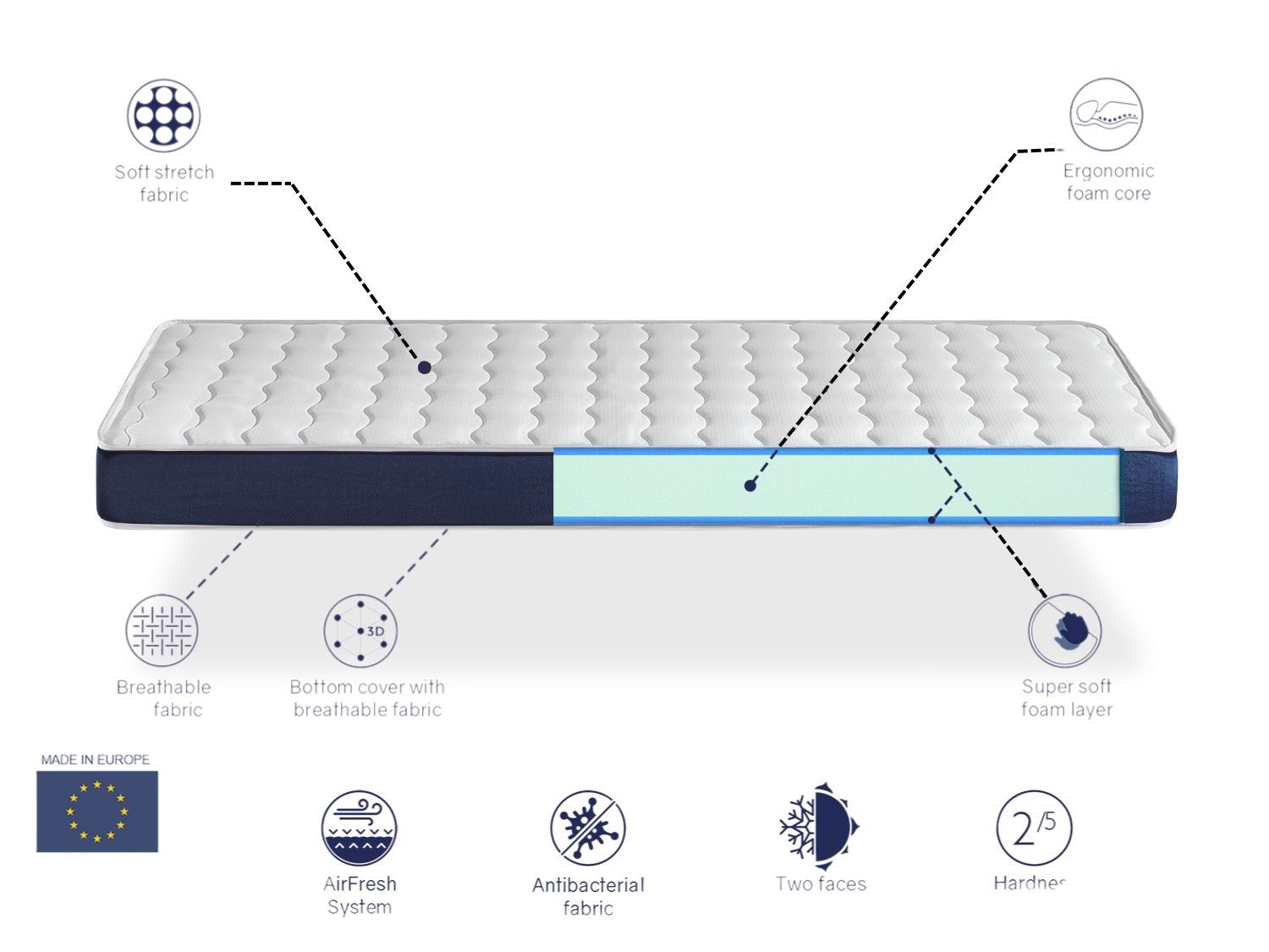 C'est un modèle léger, frais et confortable. Jeune, moderne et minimaliste, il surprendra les plus petits de la maison comme les plus exigeants. Il s'agit d'un matelas réversible qui peut être utilisé sur des lits convertibles, des canapés-lits, des lits d'enfants, etc. Économisez sur le prix, mais pas sur la qualité !
