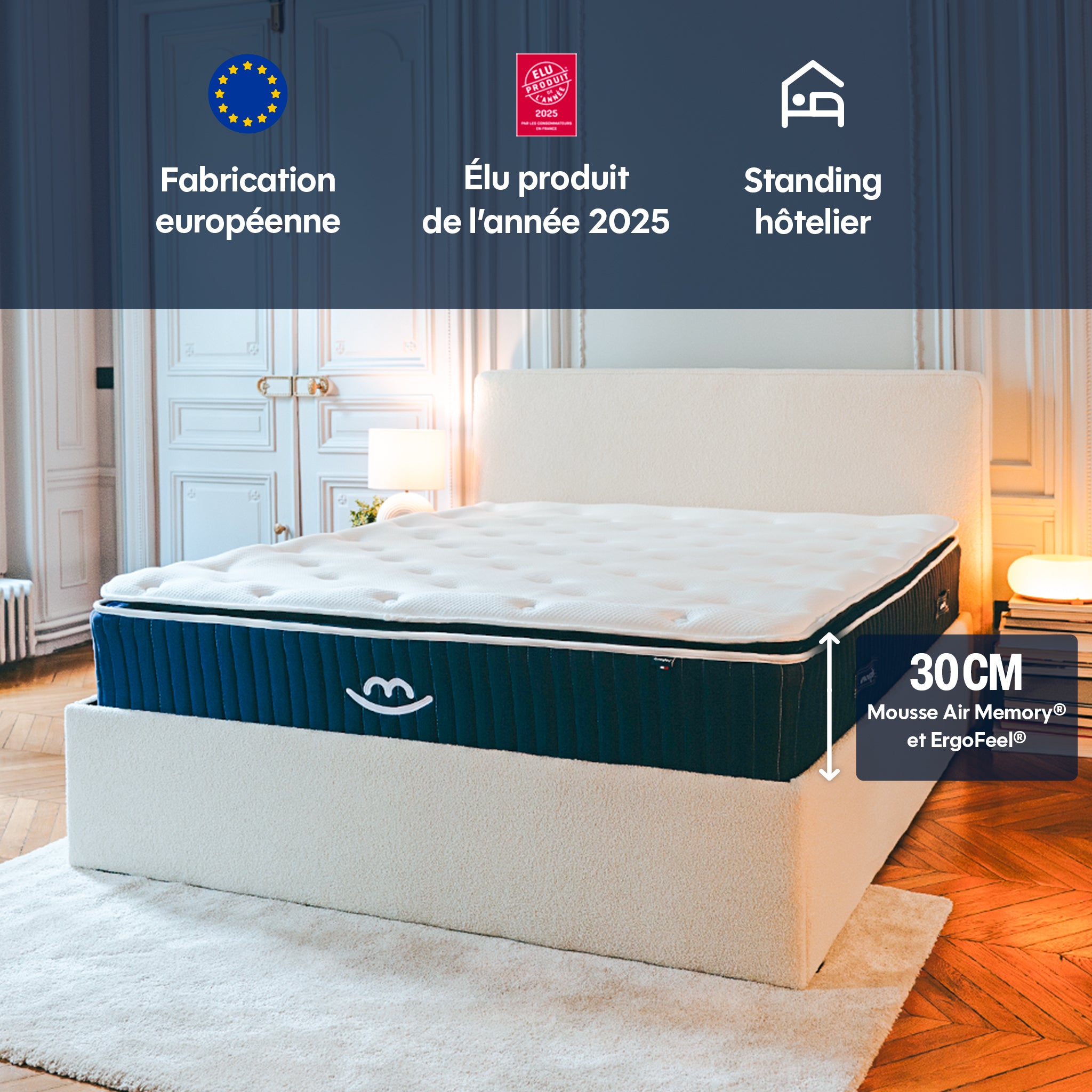 Avec ses 30 cm d’épaisseur, il combine mousse à mémoire de forme haute densité et ressorts ensachés