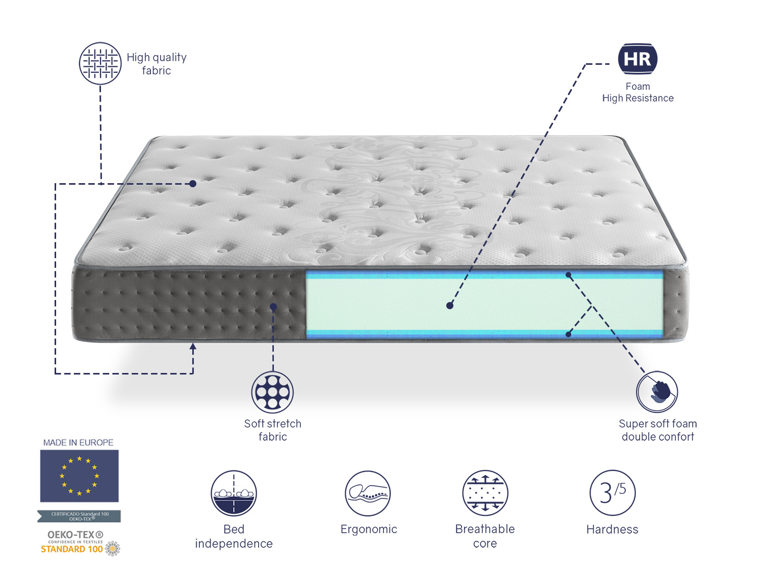 Le modèle Sfera est un matelas spécialement conçu pour les dormeurs les plus exigeants. C'est un modèle ergonomique et très adaptable grâce à ses couches de confort supérieures et inférieures. Double détente pour les zones musculaires. Son noyau est composé de mousse HR pour un couchage et une adaptation progressifs. Quels que soient nos mouvements pendant la nuit, ses couches de confort épousent la forme de notre corps et dissipent également la chaleur corporelle pour réduire l'accumulation d'humidité.