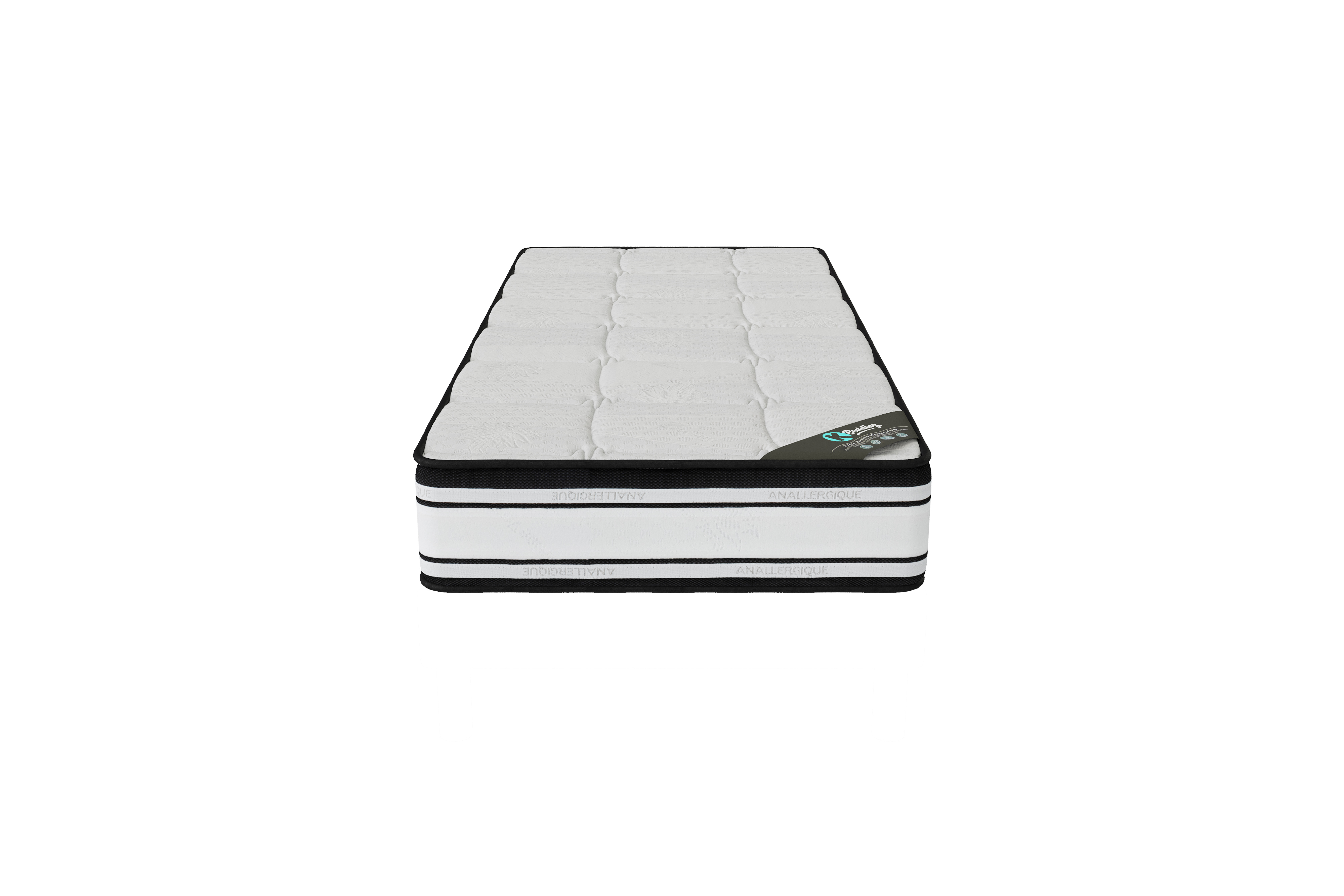 Le Matelas Grand confort 100x190 d'une hauteur de 22cm est conçu pour permettre un soutien ferme en gardant un accueil équilibré pour un meilleur confort. Son âme en mousse polyuréthane équilibré d’une densité de 25kg/m3 permet confort optimal. Garni avec une ouate mixte coton 550gr en fibre creuse hypoallergénique et ignifugé 200gr, Il assure un accueil équilibré pour un meilleur soutien répondant à toute les normes sécuritaires et hygiéniques. Ce matelas est recouvert d’un coutil piqué en jacquard hypoallergénique traité antibactérien et antiacarien. Les bandes latérales sont en tissu respirant piqué noir et blanc avec 4 poignées.
