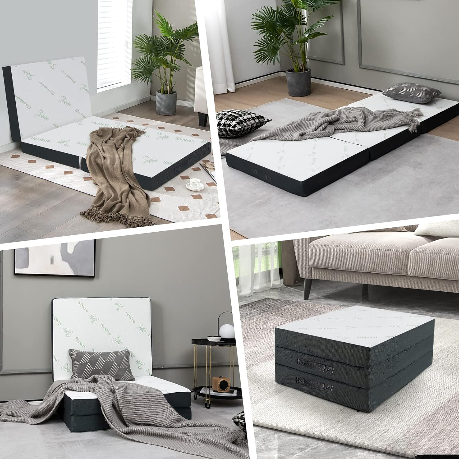 Vous recherchez un matelas d’appoint pliable ? Vous devez considérer notre matelas de lit. Le matelas en mousse haute densité et doux détend votre dos et votre colonne vertébrale, tout en vous offrant un bon environnement de sommeil. Le tissu en fibre de bambou est respectueux de l’environnement et sans odeur, ne vous inquiétez pas des allergies. De plus, le matelas en 3 parties peut être déplié et replié en quelques secondes et être rangés dans un placard ou sous un lit. Par conséquen que ce soit en voyage ou à la maison, ce matelas pliant vous offre commodité. N’hésitez pas à passer votre commande !