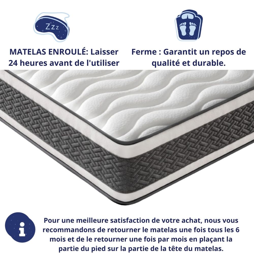 Dagostino home présente l'incroyable matelas "Montecarlo", ce matelas enroulé sous vide d'une esthétique parfaite, d'une haute fermeté, d'une respirabilité/aération et durabilité maximale a été créé pour un niveau de confort optimal. C'est un matelas de 25 cm de hauteur qui s'adapte à votre corps et garantit le soutien de toutes les parties de votre corps. Nous proposons des produits fabriqués à partir de matériaux de haute qualité et aux finitions soignées. Vous trouverez dans le matelas Montecarlo, uniquement des matériaux de haute qualité d'aération maximale et de durabilité optimal. Son noyau Ressorts Ensaches vous garantit un niveau de confort optimal, ferme et robuste dans le temps ce qui vous fournira une excellente sensation de couchage. Ce matelas non déhoussable est un produit réversible, avec double face spécial pour les mois d'été/hiver. La face d'hiver a un tissu stretch jacquard qui vous tient chaud quand les températures sont basses. La face d'été dispose d'un tissu 3d avec une respirabilité maximale qui empêche l'accumulation de chaleur . Les produits doivent être déballés au plus tard dans les 14 jours pour ne pas perdre leur garantie.