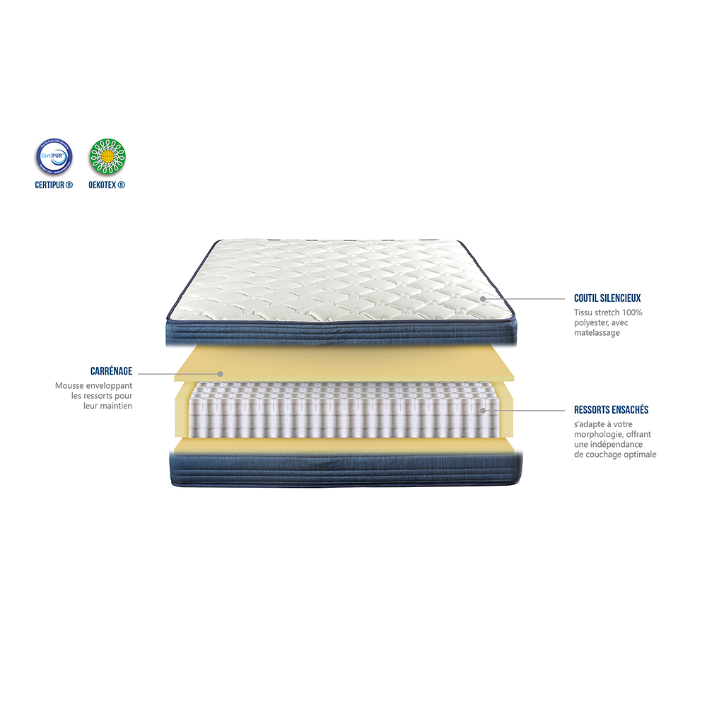 • Âme intérieure du matelas (certifiée CertiPUR) : 465 ressorts ensachés de 17 cm + 2 cm de mousse de confort de 20 kg/m³ (dessus et dessous les ressorts)