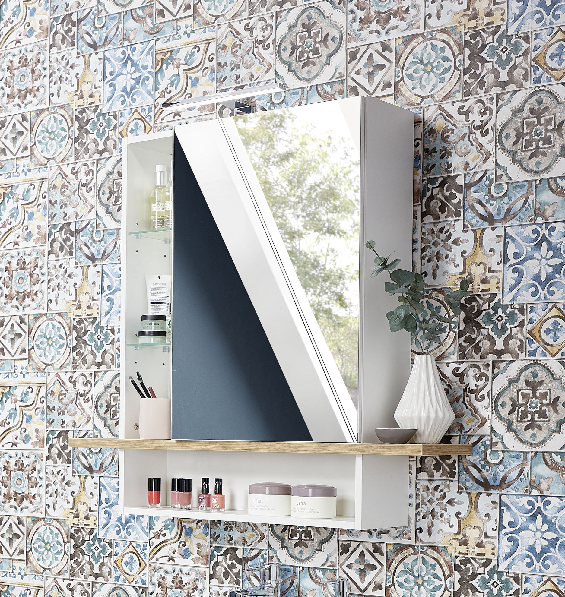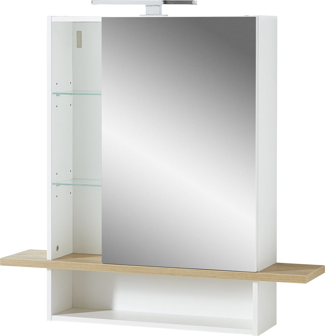 | Libellé | Matelpro - Armoire de toilette scandinave chêne/blanc Geralda - Moderne & Design -Blanc - 2 étagères derrière le miroir d'une capacité maximale de 10 |