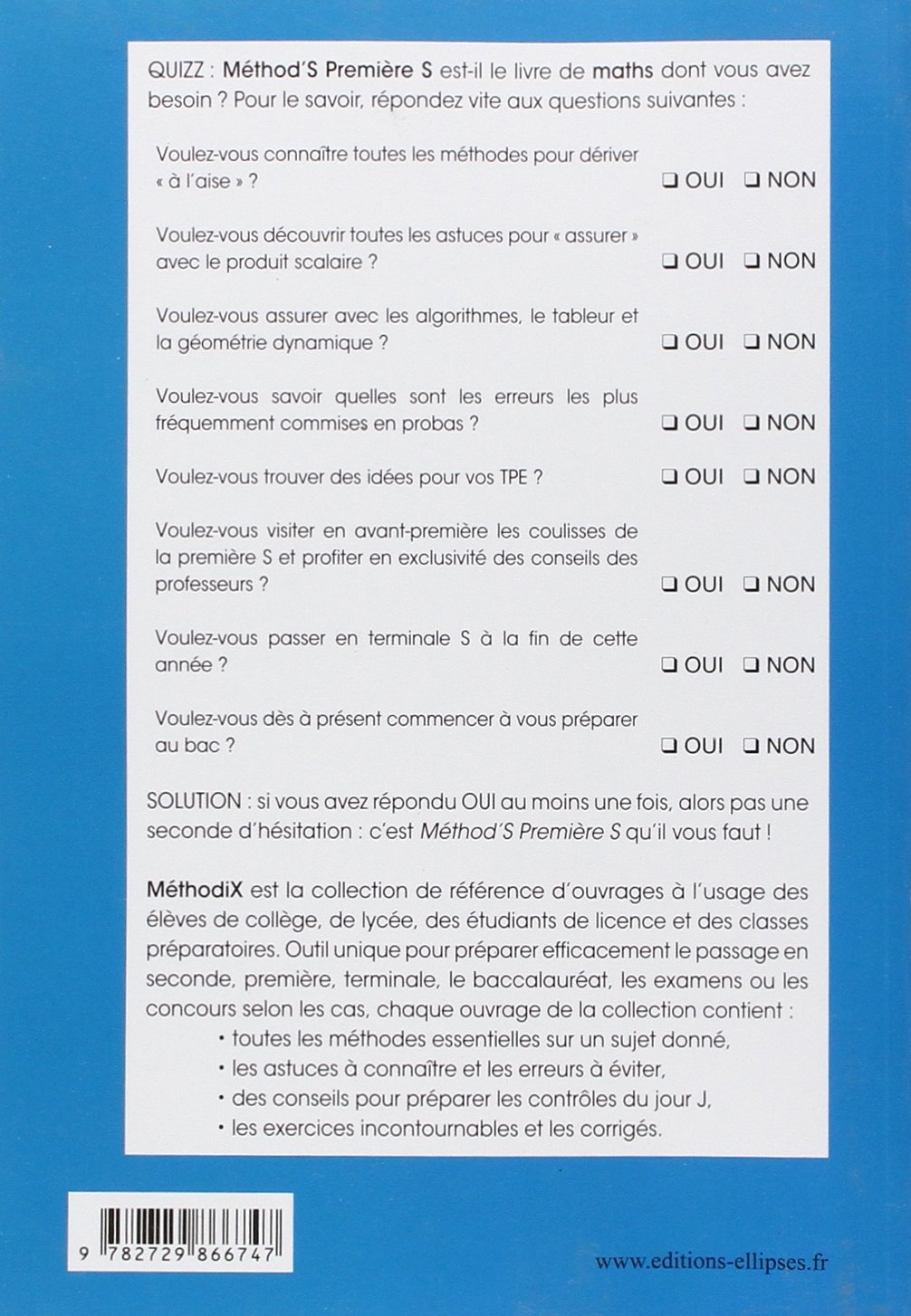 Quizz : Méthod'S Première S est-il le livre de maths dont vous avez besoin ? Pour le savoir, répondez vite aux questions suivantes : Voulez-vous connaître toutes les méthodes pour dériver « à l'aise » ? oui non Voulez-vous découvrir toutes les astuces pour « assurer » avec le produit scalaire ? oui non Voulez-vous assurer avec les algorithmes, le tableur et la géométrie dynamique ?oui non Voulez-vous savoir quelles sont les erreurs les plus fréquemment commises en probas ? oui non Voulez-vous trouver des idées pour vos TPE ? oui non Voulez-vous visiter en avant-première les coulisses de la première S et profiter en exclusivité des conseils des professeur ? oui non Voulez-vous passer en terminale S à la fin de cette année ? oui non Voulez-vous dès à présent commencer à vous préparer au bac ? oui non Solution : si vous avez répondu oui au moins une fois, alors pas une seconde d'hésitation : c'est Méthod'S Première S qu'il vous faut !