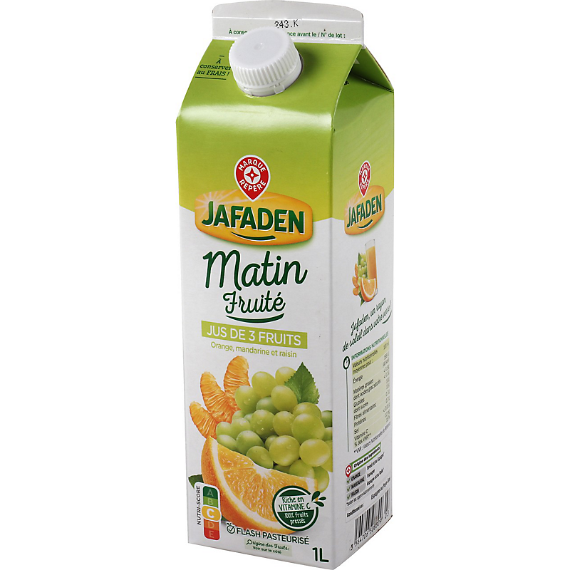Ingrédients : Jus d'orange 40 %, jus de mandarine 30 %, jus de raisin blanc 27 %, pulpe d'orange 3 %