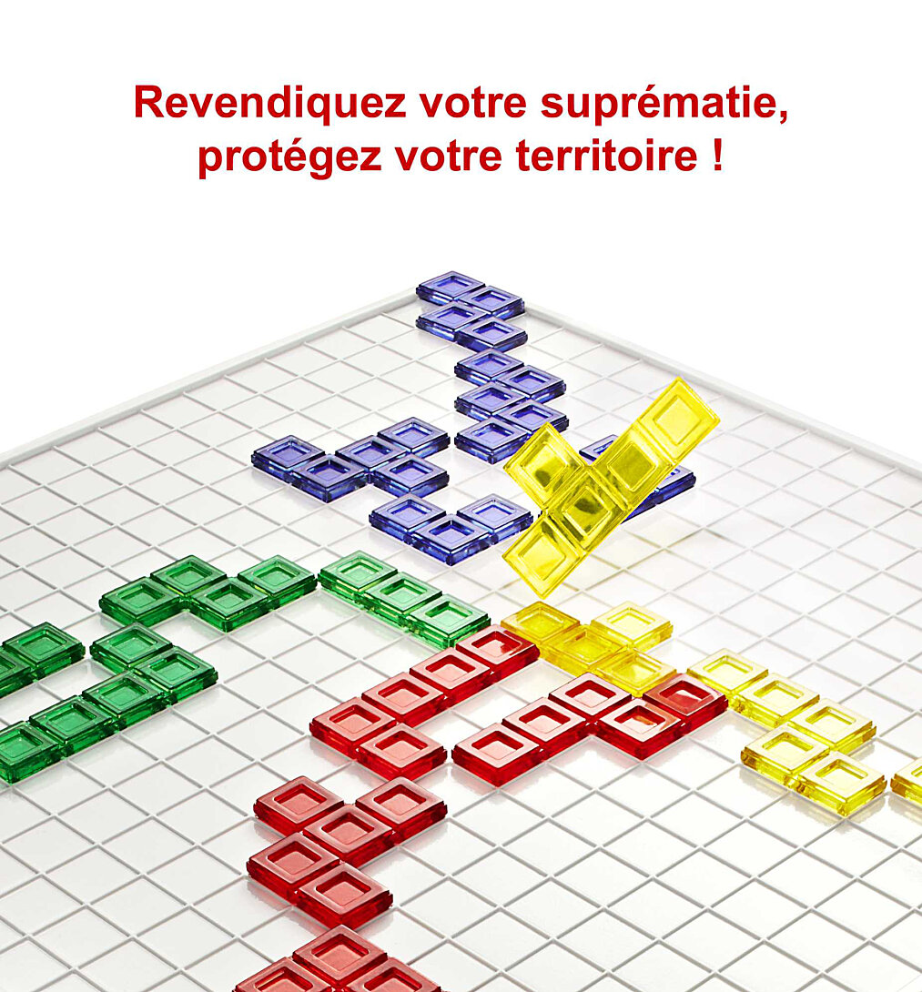 Revendique ta suprématie, protège ton territoire ! Moins d'une minute suffit pour apprendre à y jouer, mais avec ses défis infinis, ce jeu saura passionner toute la famille ! Tous les joueurs se voient distribuer 21 pièces (bleues, rouges, vertes ou jaunes) et à tour de rôle, placent leurs pièces sur le plateau. Il n'y a qu'une règle à respecter : chaque nouvelle pièce jouée doit toucher une autre pièce de même couleur, mais seulement par les coins ! Le but du jeu consiste à placer autant de pièces que possible sur le plateau. La partie est terminée lorsqu'aucun des joueurs ne peut plus poser de pièce. Le joueur qui possède le moins de carrés remporte la partie !