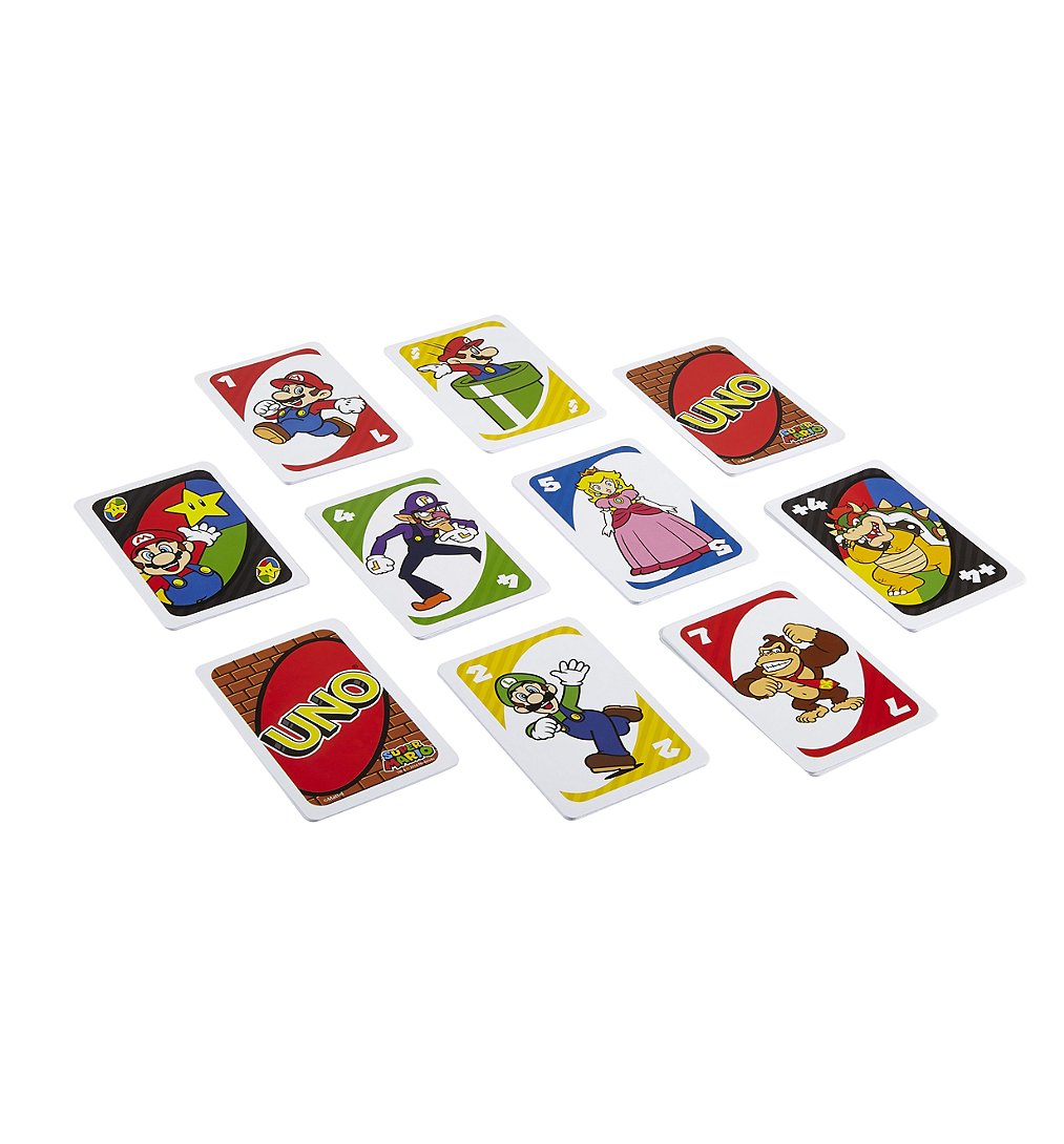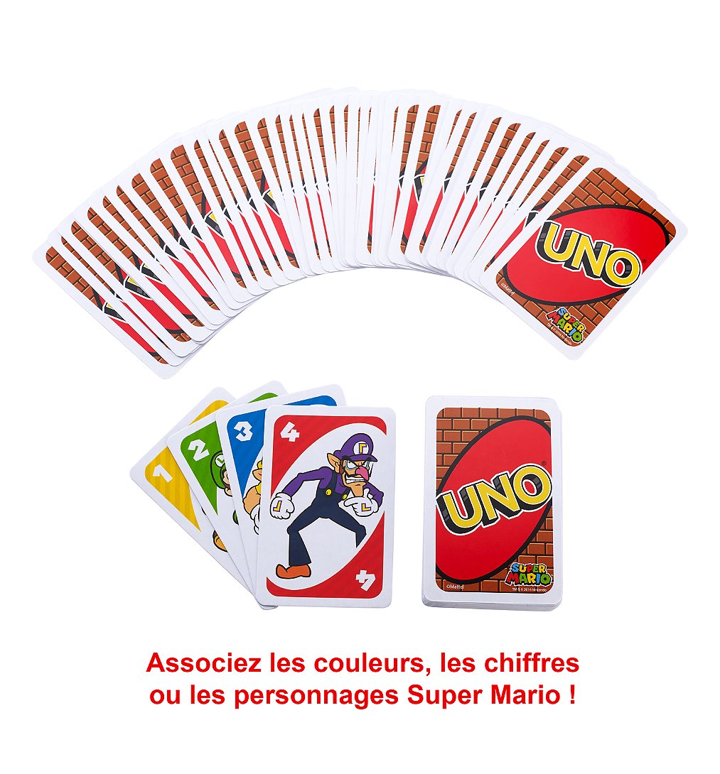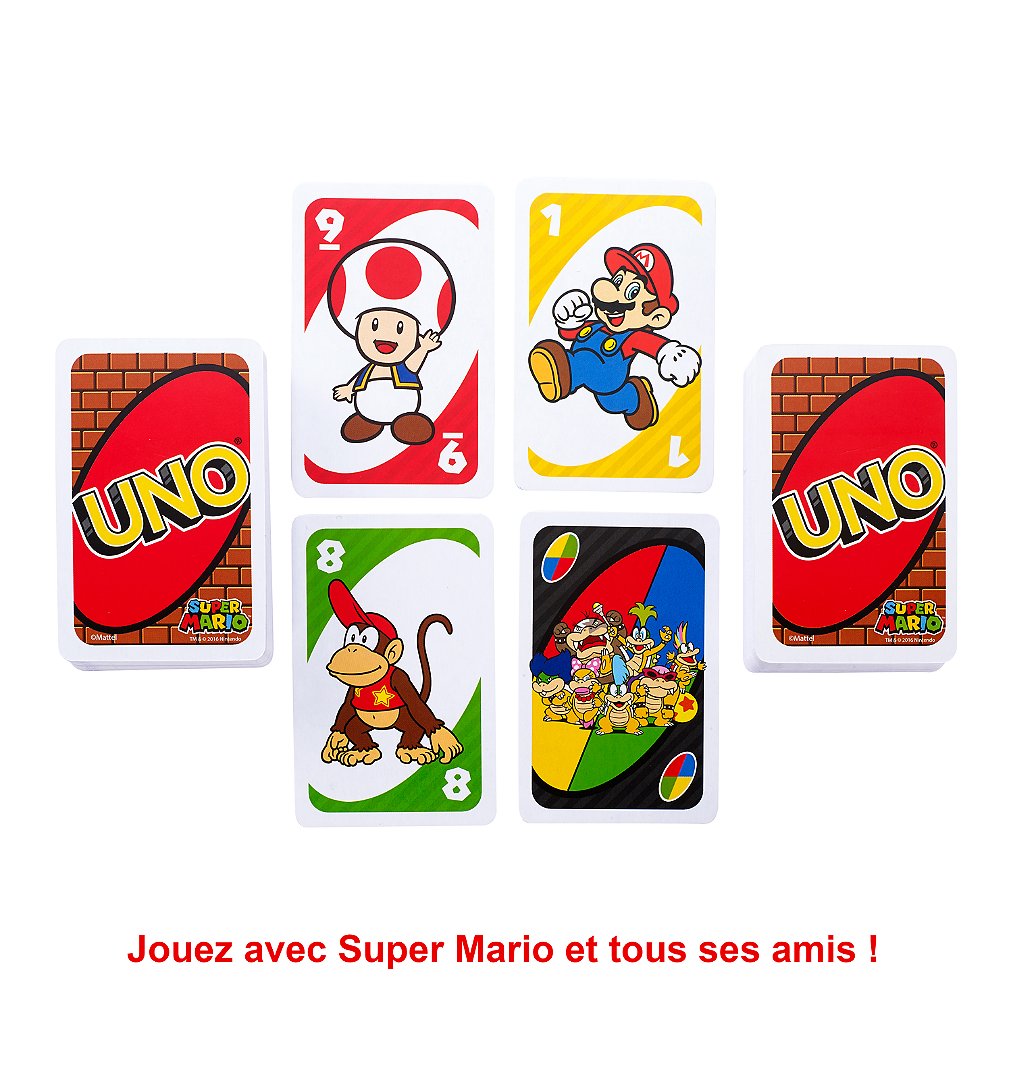 Plus produit Le jeu de cartes incontournable fait son grand retour sur le thème de Super Mario Bros !\nChacun leur tour, les joueurs associent une de leurs cartes avec la couleur ou le chiffre de la carte retournée en haut de la pile.\nMarquez des points en étant le premier joueur à se débarrasser de toutes ses cartes.\nLe premier joueur ou la première équipe à atteindre 500 points gagne la partie.\nInclut une carte spéciale Mario Super Star et deux cartes personnalisables.