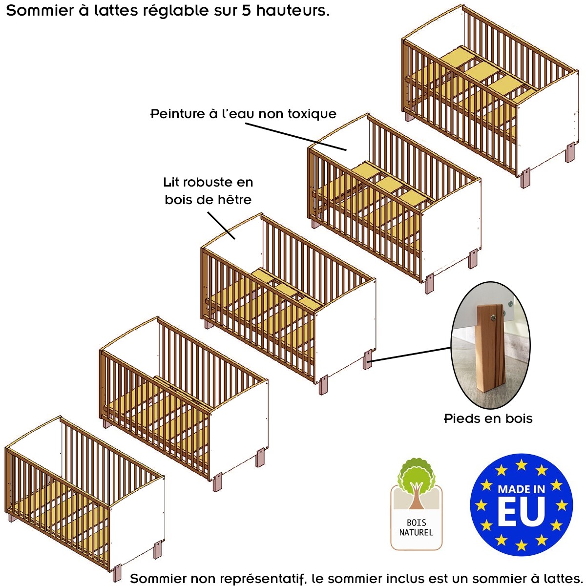 Il est équipé d'un sommier à lattes (pour une meilleure circulation de l'air) réglable en hauteur sur 5 positions (sur une plage de 25 cm). Il s'adapte donc à l'âge et à la taille de votre enfant, ce qui assure sa sécurité. Il assure également votre confort en vous évitant de trop vous baisser pour prendre/déposer votre enfant dans le lit.