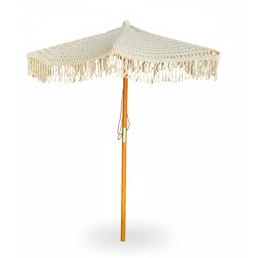 Maui - Parasol Macramé - poly-coton avec toile occultante amovible. Mât en bois de hêtre. Poulie double en zinc. Dimensions (Ø x H) 250 x 250 cm - Mât Ø 48mm - baleines 17 * 35mm - Certifié FSC