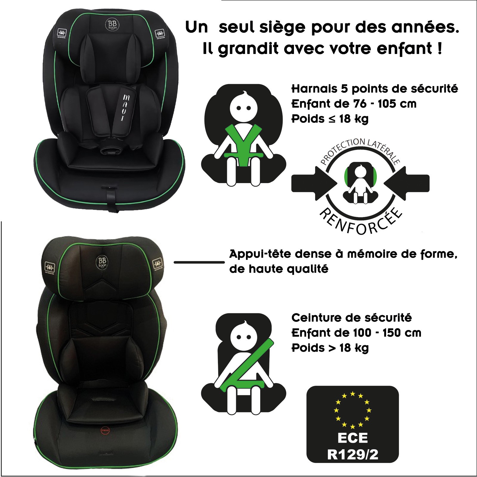| Libellé | MAUI Siège-auto ceinturé évolutif R129 76-150 cm pour enfant Noir |