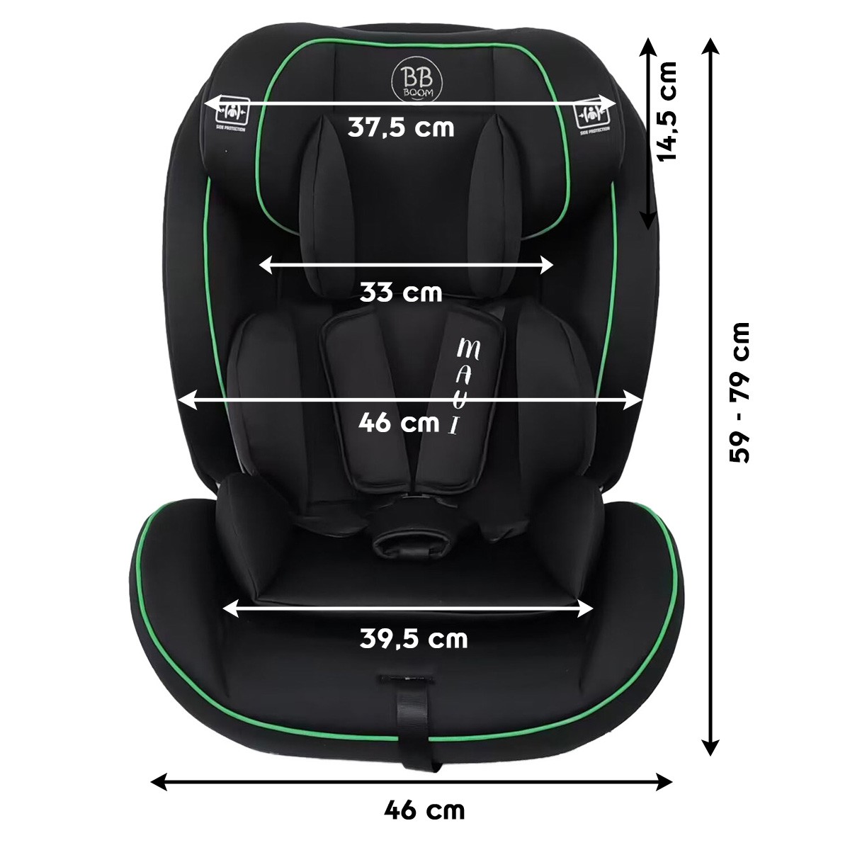 MAUI Siège-auto ceinturé évolutif R129 76-150 cm pour enfant, sans Isofix. Disponible en plusieurs coloris. CARACTÉRISTIQUES : Ce siège-auto ceinturé répond aux nouvelles normes R129/2 et s'utilise sans Isofix. Cela permet au siège-auto MAUI d'être installé dans tous types de véhicules, même les plus anciens ou les fourgonnettes. En effet, pas besoin d'une voiture équipée des attaches Isofix puisqu'il s'installe à l'aide de la ceinture de sécurité. Il est facile à déplacer d'un véhicule à l'autre et s'installe très rapidement. Par exemple, lorsque les grands parents récupèrent leurs petits-enfants, ils peuvent installer le siège-auto rapidement et facilement. Ce siège-auto est léger, il est donc facile à transporter pour des voyages en avion par exemple. Ce siège-auto offre une protection maximale contre les chocs latéraux. La mousse à mémoire de forme de l'appui-tête est ferme et de qualité. Cela assure un confort optimal pour votre enfant. Ce siège-auto évolue en même temps que votre enfant. Il dispose de 7 positions de réglage pour l'appui-tête. Pour les enfants de 76 à 105 cm avec un poids inférieur ou égal à 18 kg, le siège-auto est utilisable avec le harnais de sécurité 5 points intégré et des coussins confortables et robustes. Pour les enfants de 100 à 150 cm avec un poids supérieur à 18 kg, le siège-auto est utilisable avec la ceinture de sécurité de la voiture. Ce siège-auto s'adapte donc a tous les besoins jusqu'à 150 cm. Housse amovible et lavable en machine à 30°. Conforme aux normes de sécurité européennes (R129). DIMENSIONS ET POIDS : Appui-tête : L 37,5 x H 14,5 cm. Siège-auto : L 46 x H 59 à 79 cm. Assise interne : L 39,5 cm. Dossier interne : L 33 cm. Poids : 7,2 kg.