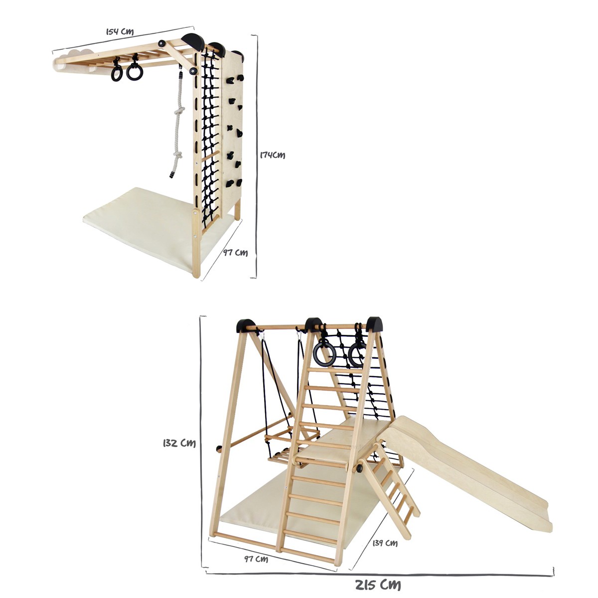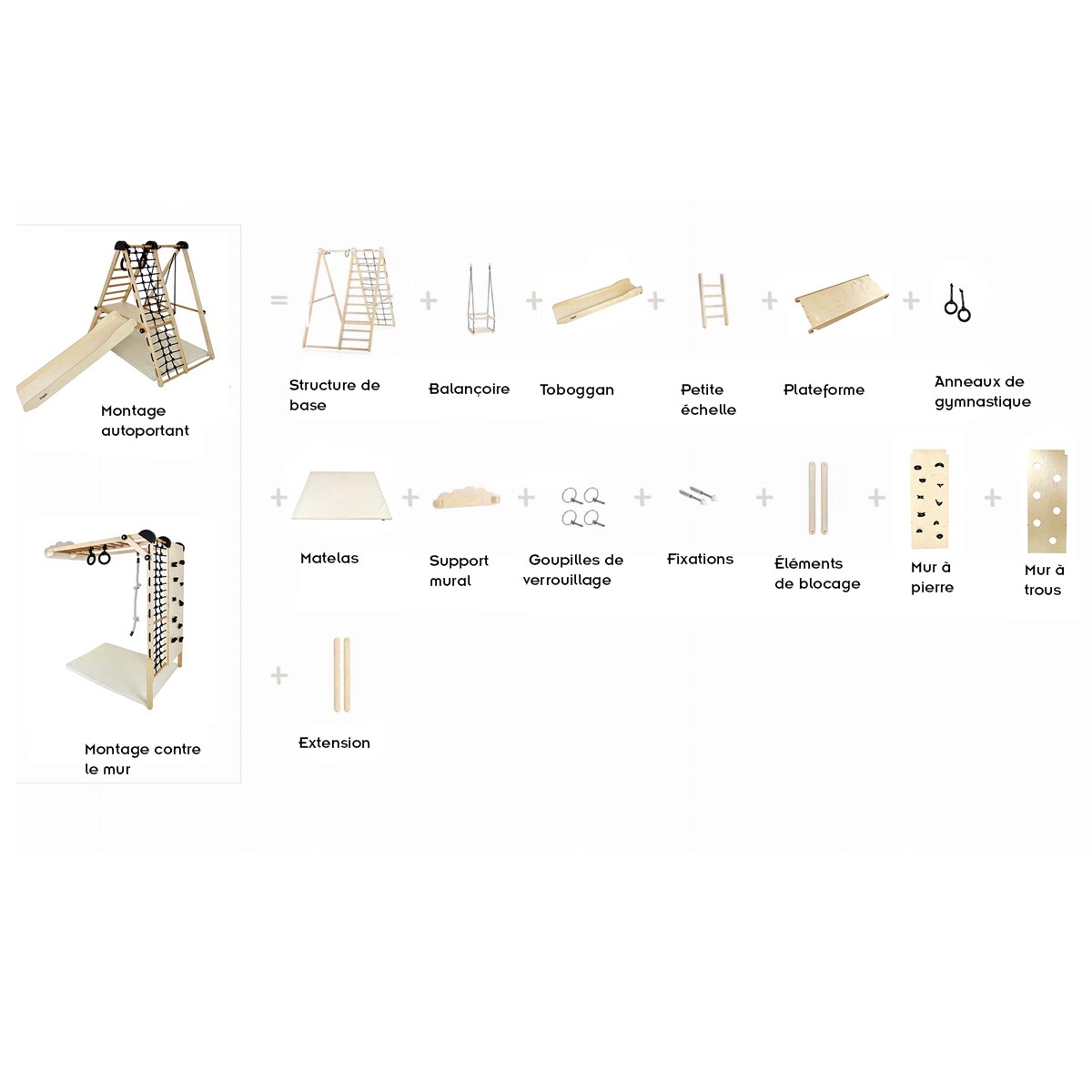 MAX Aire de jeux d'intérieur modulable pour enfants en bois À partir de 6 mois. CARACTÉRISTIQUES : Dès 6 mois, les enfants pourront se dépenser et jouer dans ce terrain de jeu d'intérieur. Modulable, il peut être utilisé en version autoportante ou fixé au mur. Ces deux modules permettent une multitude d'activités. Cette aire de jeux est idéale pour développer la motricité dès le plus jeune âge, favoriser l'imagination et stimuler la créativité. Les enfants découvrent leurs propres capacités et leurs propres limites. Pour développer l'agilité et la coordination, plusieurs activités d'escalades sont disponibles : mur de cordes, mur avec poignées, mur à trous et grande échelle ainsi que des anneaux de gymnastique. Les plus grands pourront balancer les plus jeunes ou leur faire dévaler le toboggan. Un tapis permet aux enfants de jouer en toute sécurité. Simple à monter et à moduler, la structure est facile à plier et se range à la verticale à l'aide de son support mural. Des extensions permettent d'agrandir la structure (25 cm supplémentaires en hauteur). Les enfants peuvent ainsi profiter du complexe jusqu'à 12 ans. Fabriqué en bois. Corde à nœuds non inclue. À monter. L'ENSEMBLE CONTIENT : 1 base Plateforme de jeu Anneaux de gymnastique 1 balançoire 1 toboggan avec une piste pour petites voitures au dos 1 petite échelle 1 support mural 1 mur d'escalade à trous 1 mur d'escalade avec pierres 1 matelas 2 extensions de 25 cm DIMENSIONS ET POIDS : Contre le mur : L 97 cm x l 154 cm x H 149 cm (sans extensions). Forme portique : L 97 cm x l 139 cm x H 132 cm. Longueur avec toboggan : 251 cm.