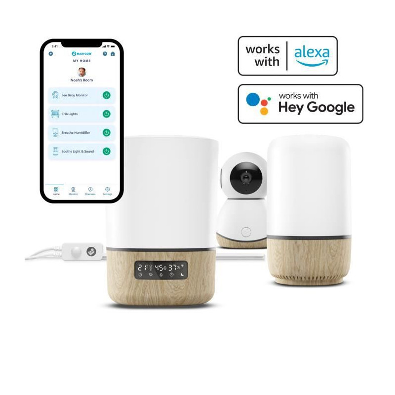 Connected Home est une gamme élégante de produits de puériculture intelligents qui se connectent via une seule application facile à utiliser. La gamme est composée de la veilleuse de lit Glow, de l'écoute-bébé vidéo See, de l'humidificateur Breathe et de la veilleuse musicale Soothe. Une technologie intelligente conçue pour veiller, rassurer et apaiser votre bébé et vous offrir la tranquillité d'esprit. Chaque produit avancé est doté de routines automatisées et de fonctions personnalisées à adapter et à programmer selon le mode de vie de votre famille. Grâce à des capteurs intelligents, les produits Connected Home peuvent interagir de manière transparente les uns avec les autres. Par exemple, lorsque l'écoute-bébé vidéo See détecte que votre bébé se réveille, il peut allumer automatiquement la veilleuse musicale Soothe, pour rassurer votre bébé. L'application Maxi-Cosi Connected Home vous permet de rester proche de votre bébé 24 h/24 et 7 j/7, en vous garantissant que votre tout-petit est en sécurité, rassuré et apaisé en permanence. Une connexion Wi-Fi 2,4 GHz est requise pour la configuration de ce produit dans l'application Maxi-Cosi Connected Home.