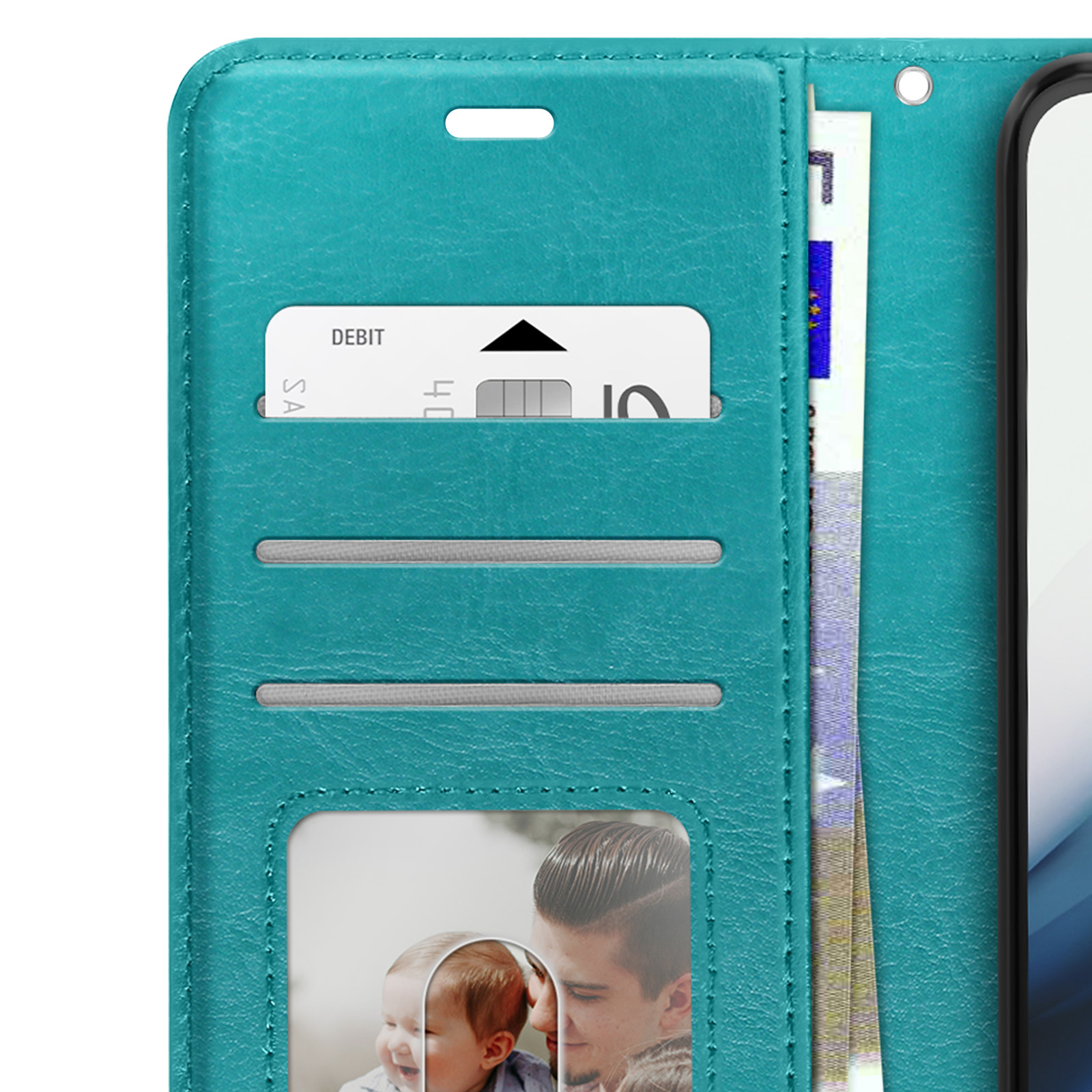 • La poche transparente inférieure permet d'afficher une photo ou une carte d'identité