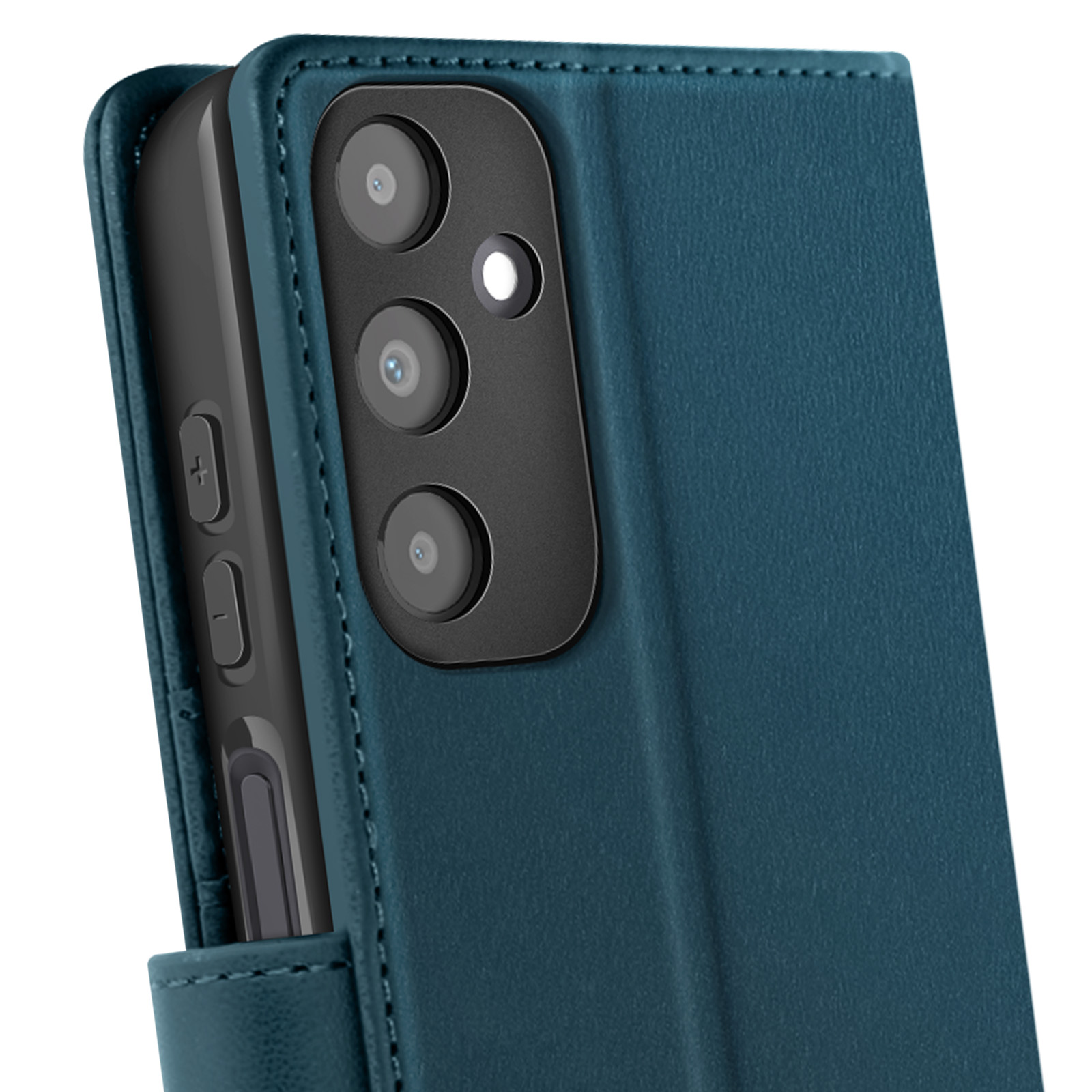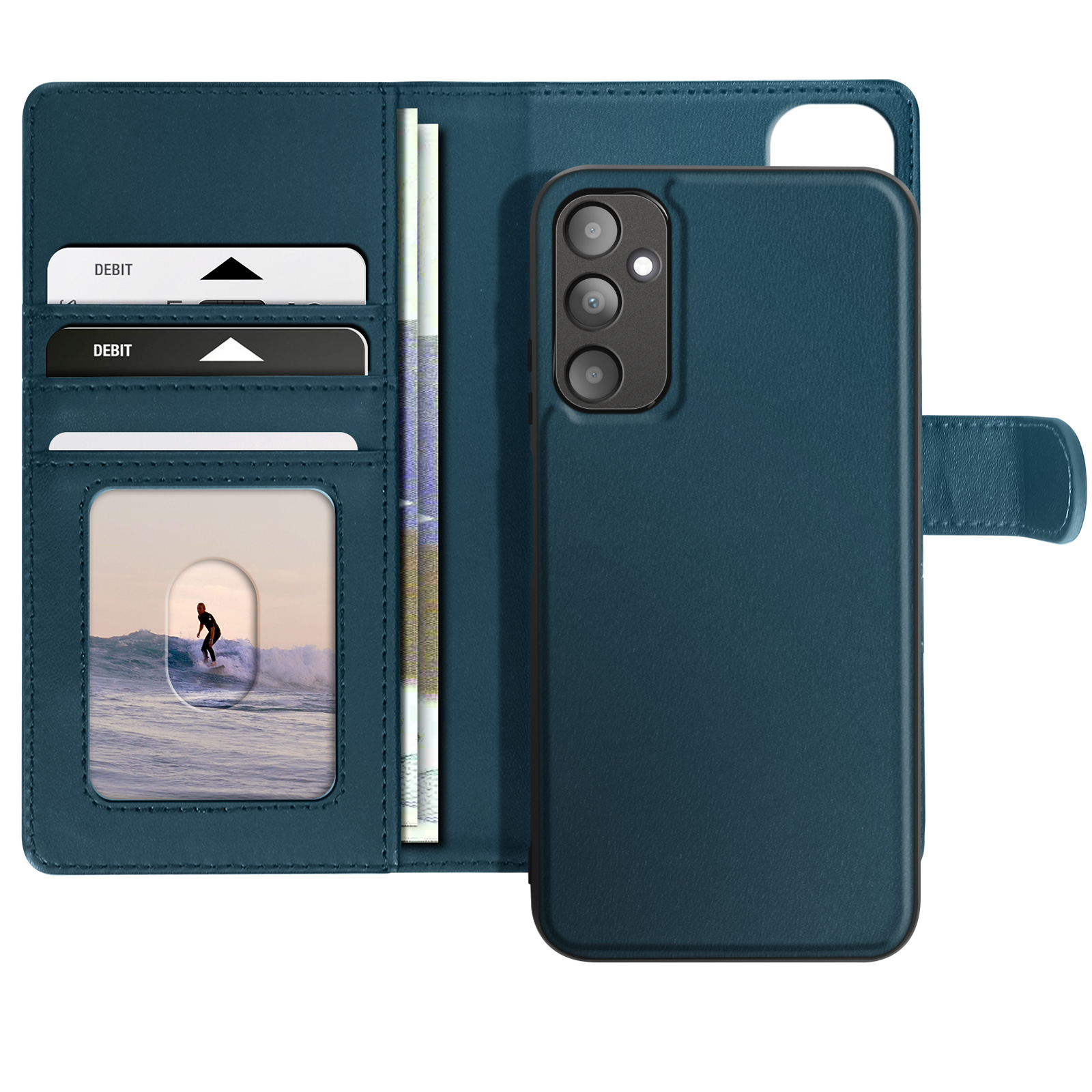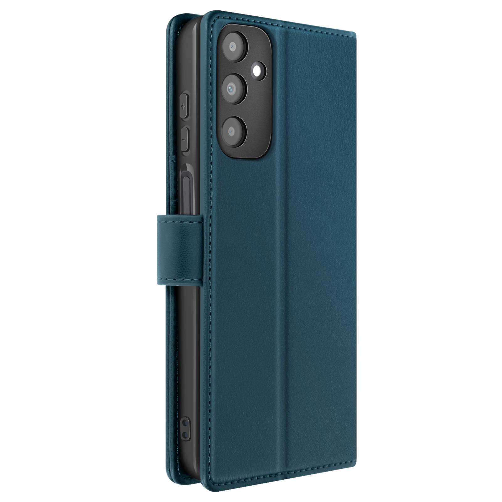 Étui Clapet Mayaxess Bleu pour Samsung Galaxy A05S. Combine étui portefeuille et coque détachable. Fixation magnétique puissante maintenant la coque en place. Support Vidéo. Porte-cartes. Découpes précises. Design élégant.