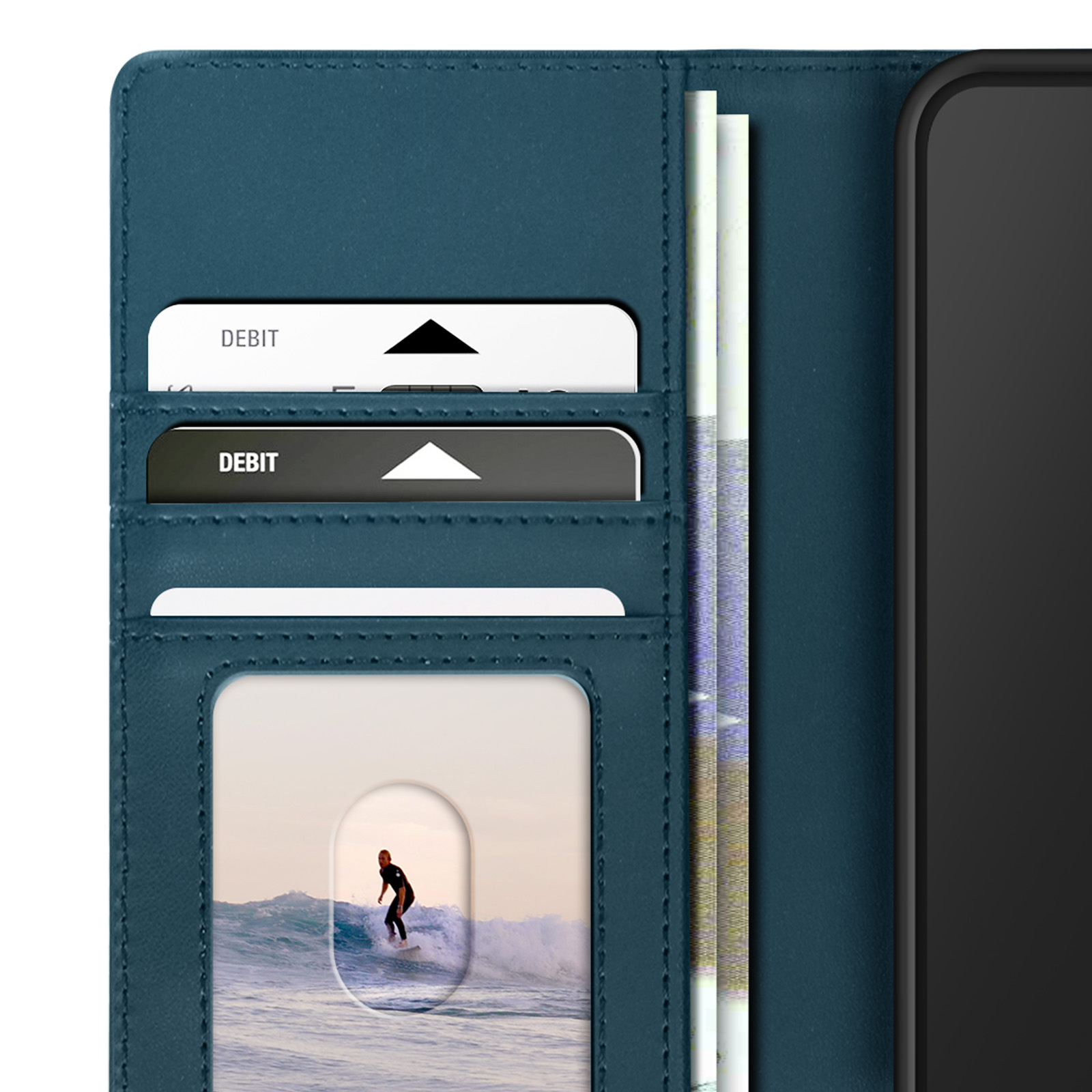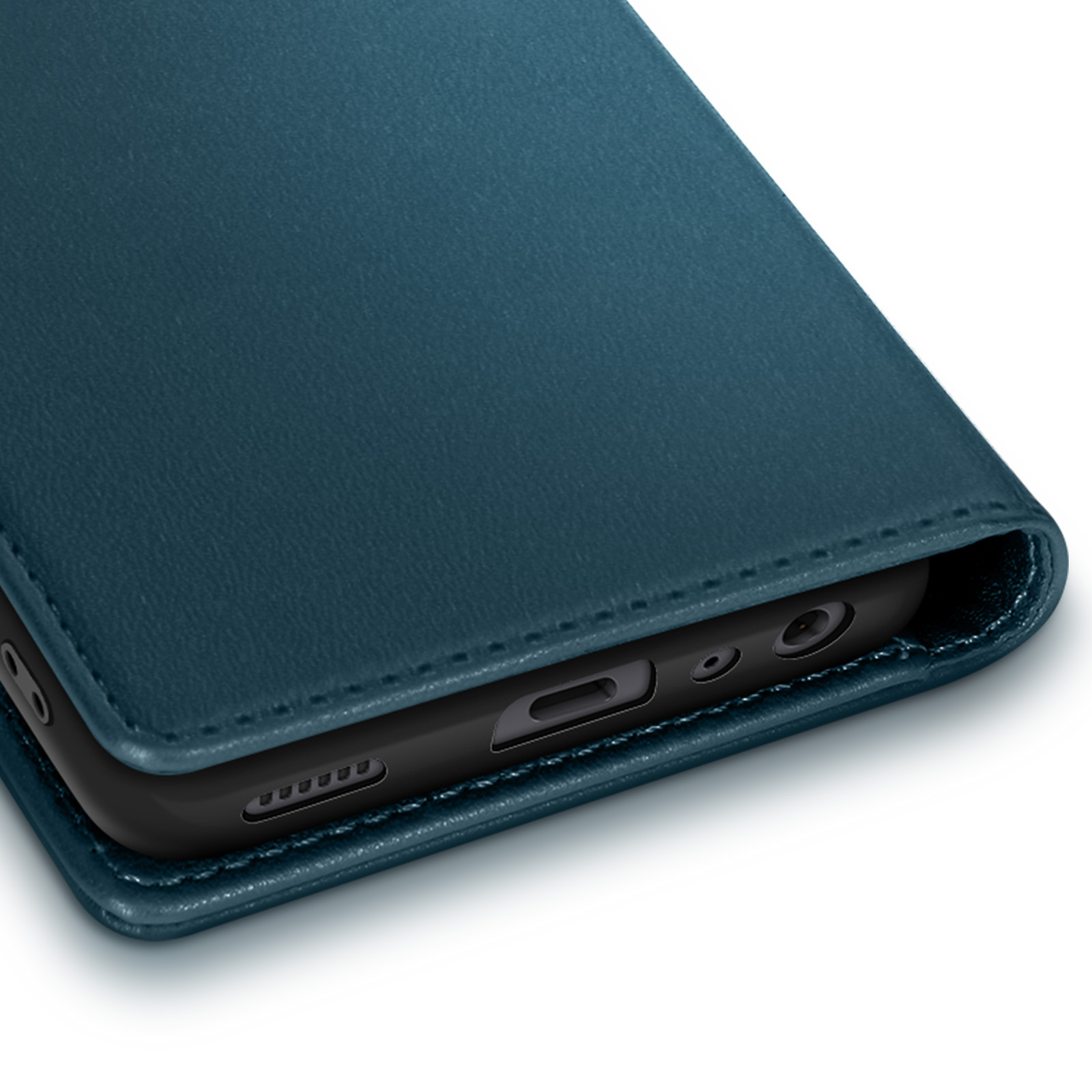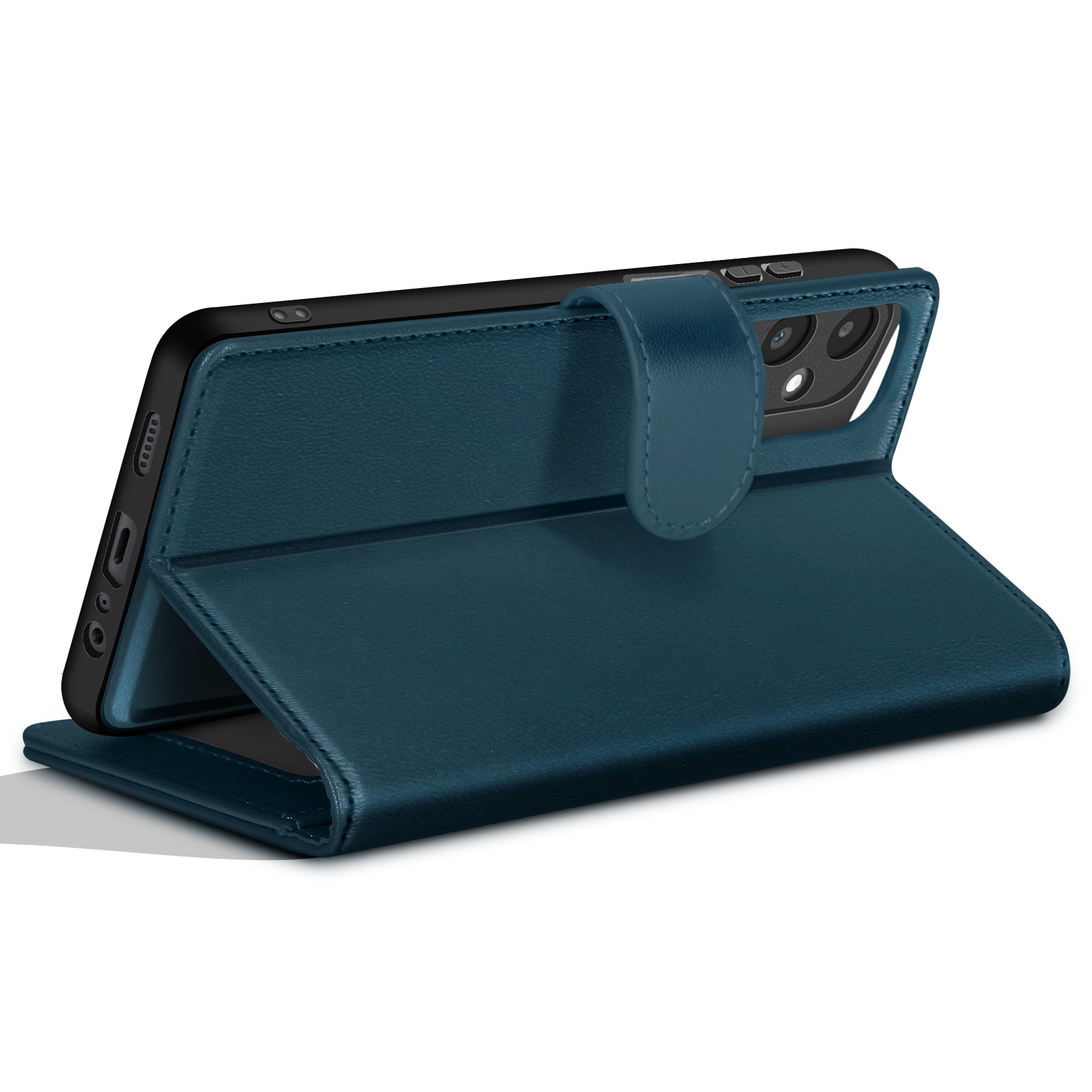 Étui Clapet Mayaxess Bleu pour Samsung Galaxy A05S. Combine étui portefeuille et coque détachable. Fixation magnétique puissante maintenant la coque en place. Support Vidéo. Porte-cartes. Découpes précises. Design élégant.