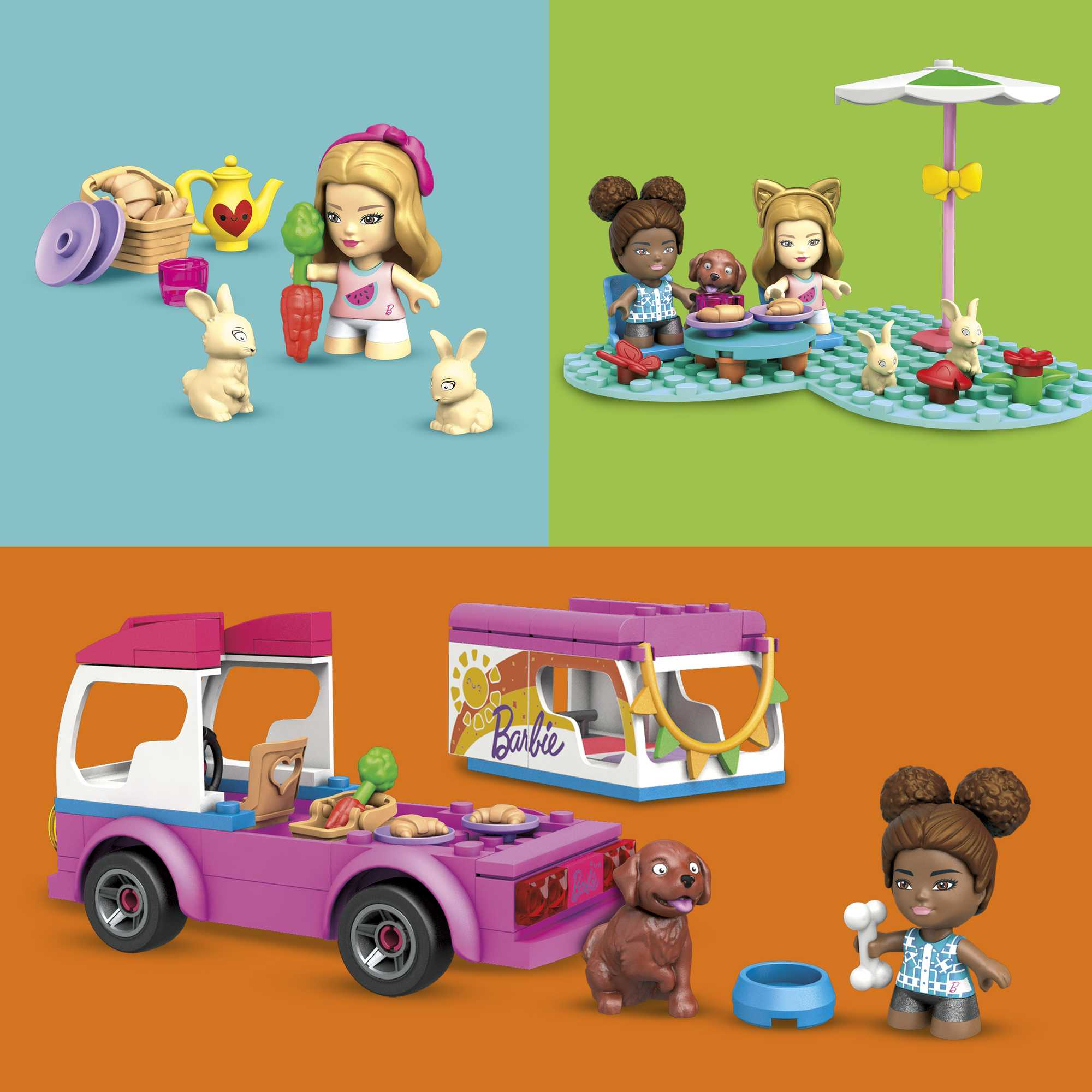 Description du produit Laissez-vous embarquer dans une Aventure en Camping-car de rêve en prenant la route de l’imagination. Vivez des histoires palpitantes en plein air en construisant ce camping-car rose rempli d’accessoires et de surprises. Explorez la nature sauvage et trouvez un coin parfait pour pique-niquer avec des accessoires tels qu’une table, des chaises, des croissants et plus encore. À l’heure du coucher, créez un coin douillet en enlevant le toit du camping-car pour le transformer en espace de couchage avec 2 lits, où les 2 mini-poupées Barbie pourront s’installer pour dormir à la belle étoile. Ce coffret de construction conçu pour les plus jeunes bâtisseurs est facile à assembler et propice à créer de nouvelles histoires. Idéal avec les coffrets Wonder Builders, à partir de 5 ans