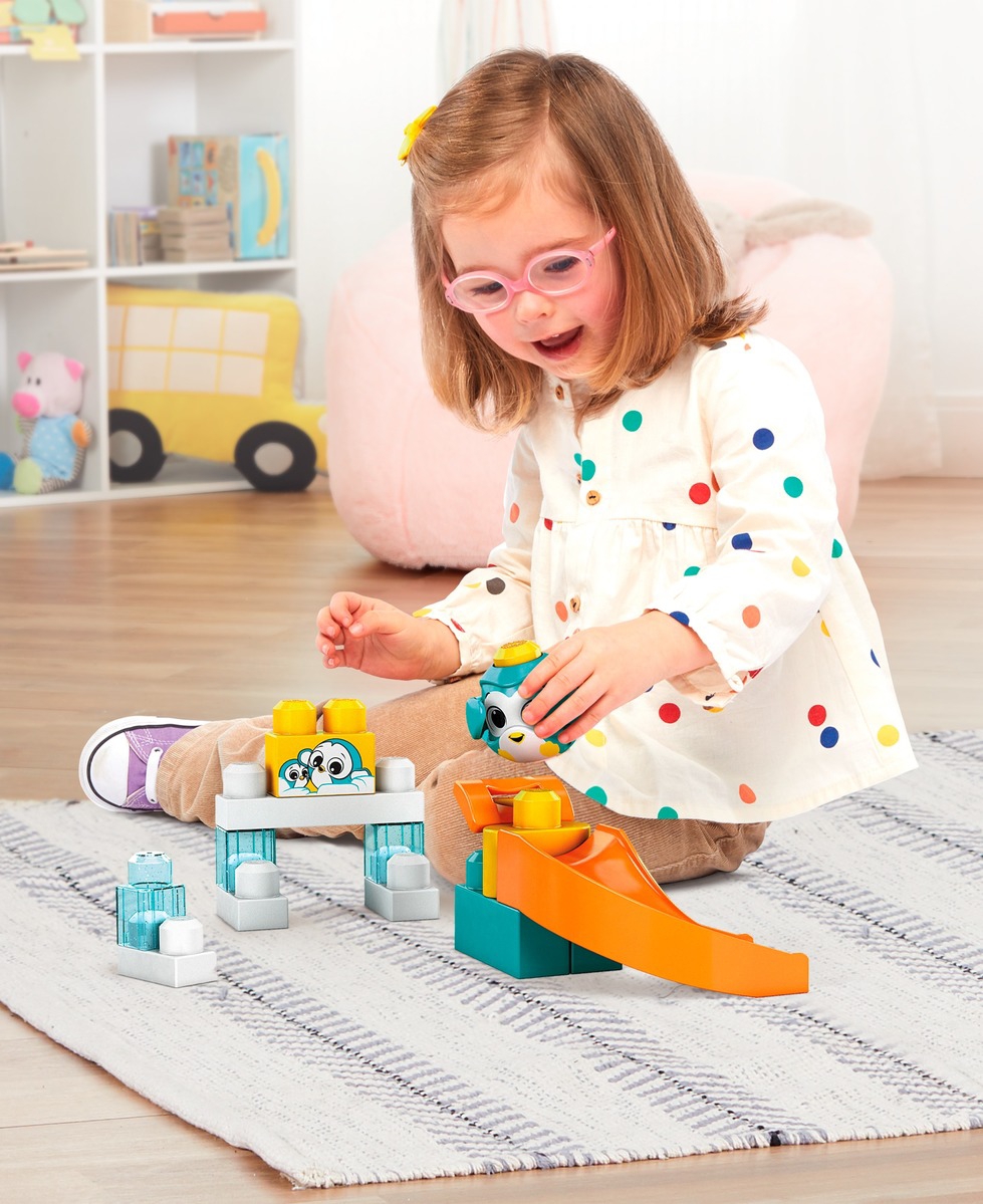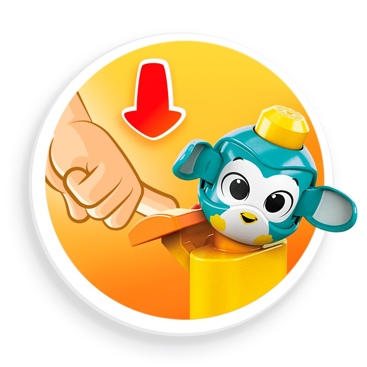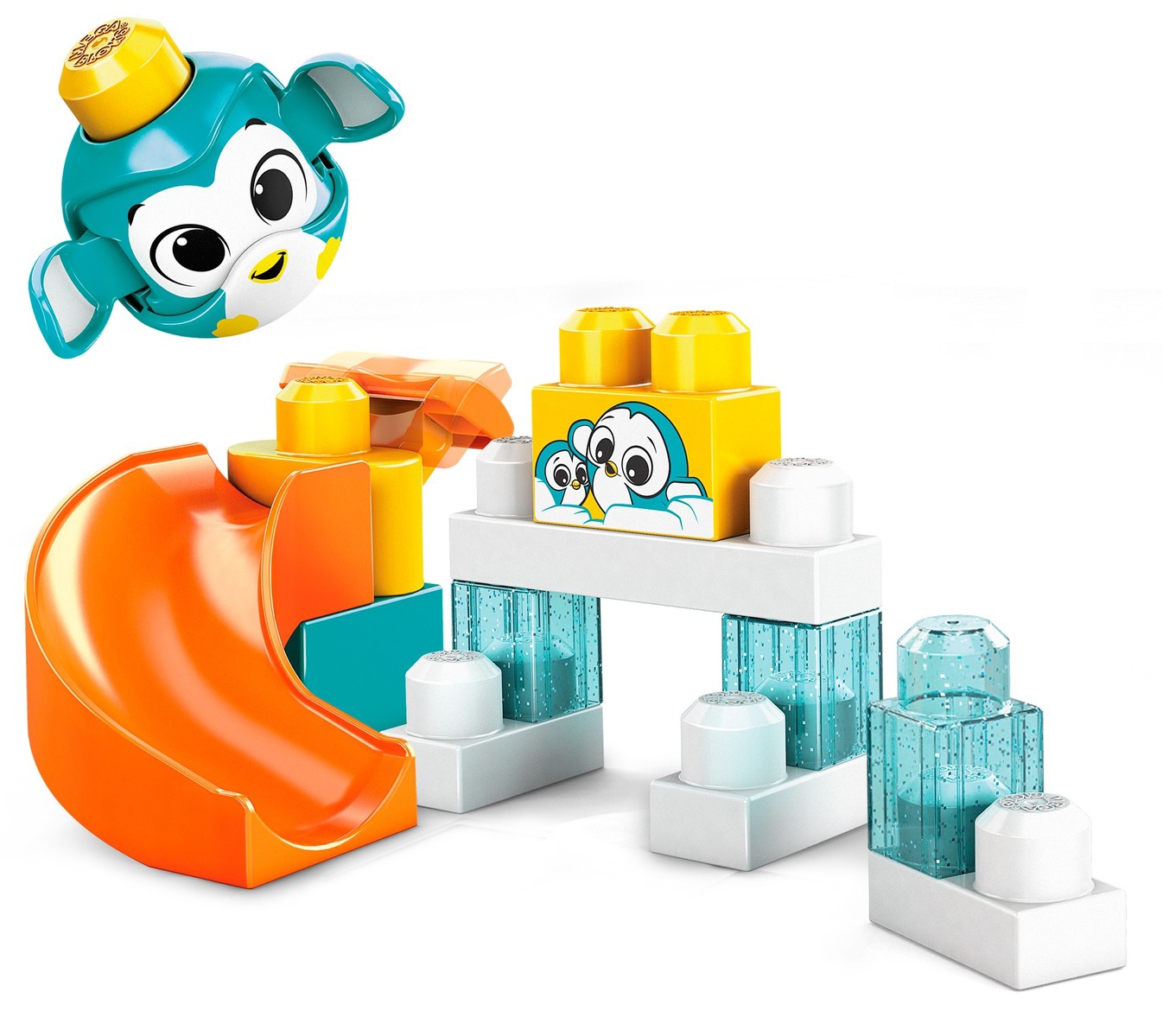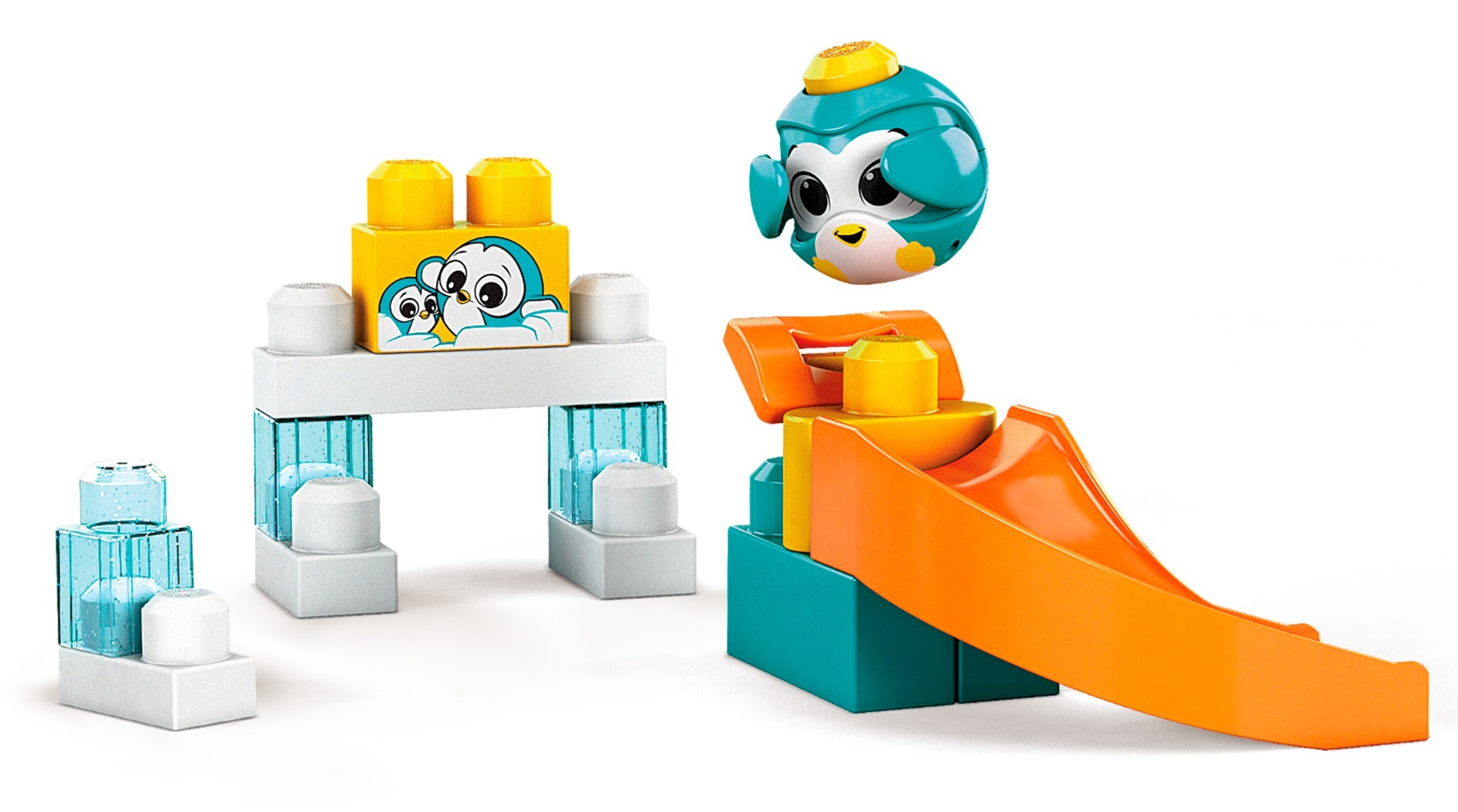Appuyez sur le haut de sa tête pour voir le Coucou Blocs dévaler le toboggan. Faites glisser votre pingouin sur la rampe du toboggan. Inclus un Coucou Blocs et son environnement à construire