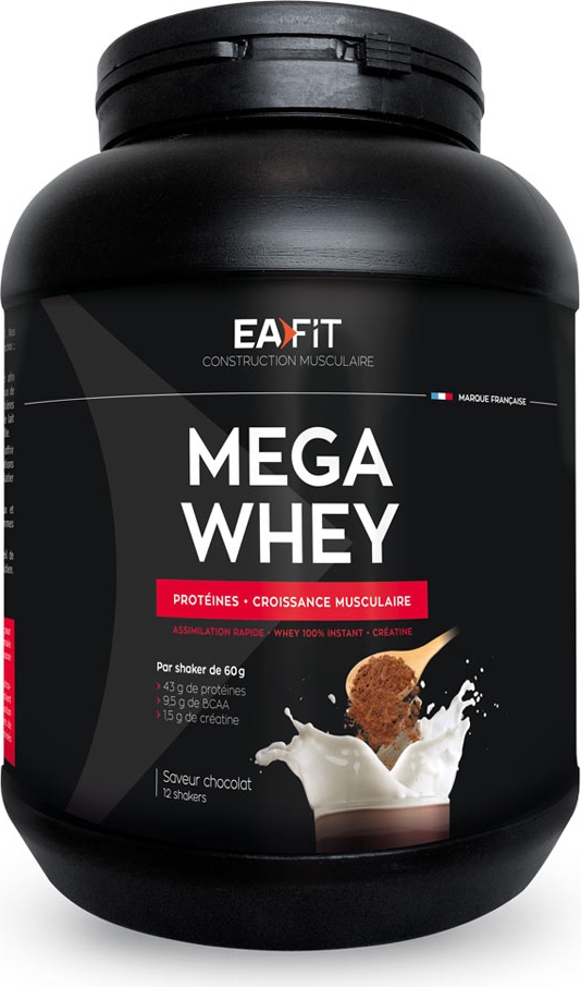 MEGA WHEY a été formulée en laboratoire par nos spécialistes en nutrition et nos athlètes pour répondre spécifiquement à toutes les personnes recherchant une croissance musculaire maximale après une phase de plateau grâce aux protéines qui contribuent à l’augmentation de la masse musculaire. Les protéines de lactosérum sont obtenues par deux techniques de microfiltration ultraperformantes garantissant la régularité et l’excellente qualité des protéines. MEGA WHEY contient également de la créatine dont les effets ont été démontrés sur l’explosivité pour une consommation journalière de 3 g. MEGA WHEY contient également des peptides de whey*, issu d’hydrolysats de protéines de lactosérum et présente un aminogramme avec une teneur en BCAA (Acides Aminés Branchés) exceptionnelle de 23 g pour 100 g de protéines.