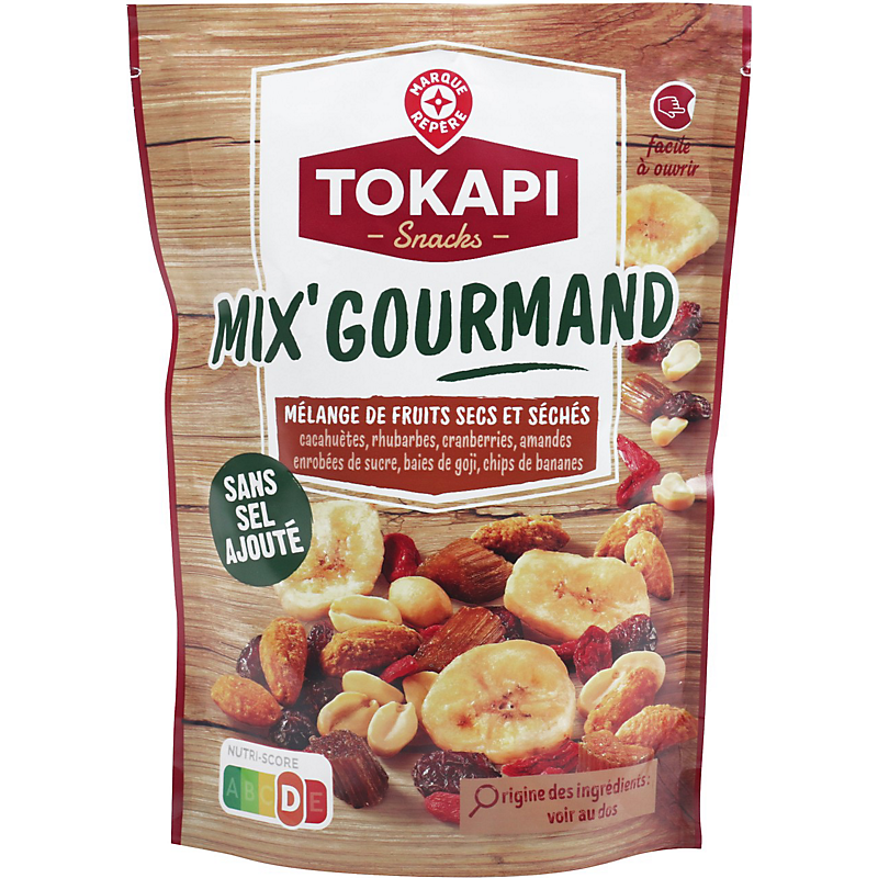 Mélange de cacahuètes grillées, rhubarbes sucrées et séchées, cranberries (canneberges) sucrées et séchées, amandes enrobées de sucre, baies de goji séchées et chips de bananes sucrées et aromatisées TOKAPI