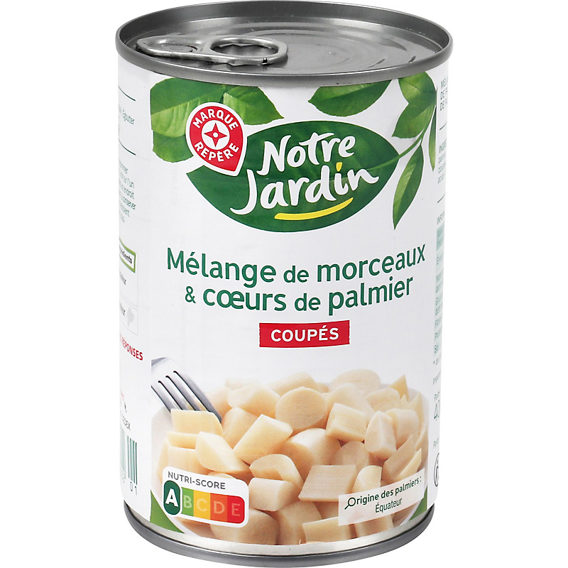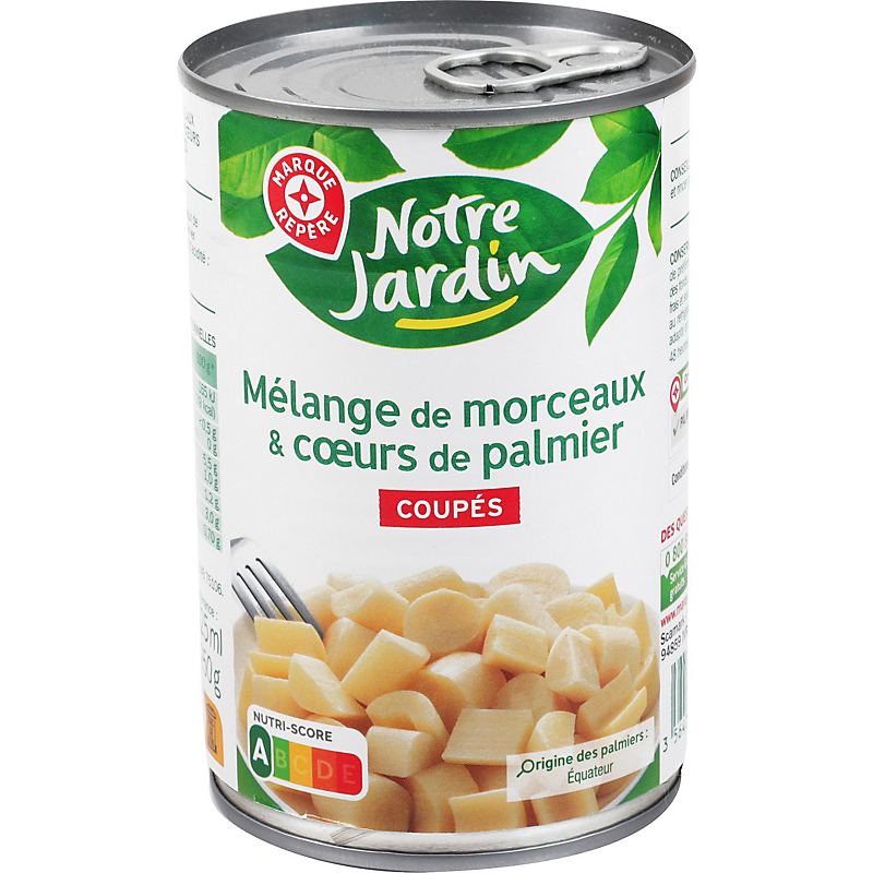 Ingrédients : Morceaux de palmier, eau, cœurs de palmier coupés, sel, correcteur d'acidité : acide citrique.
