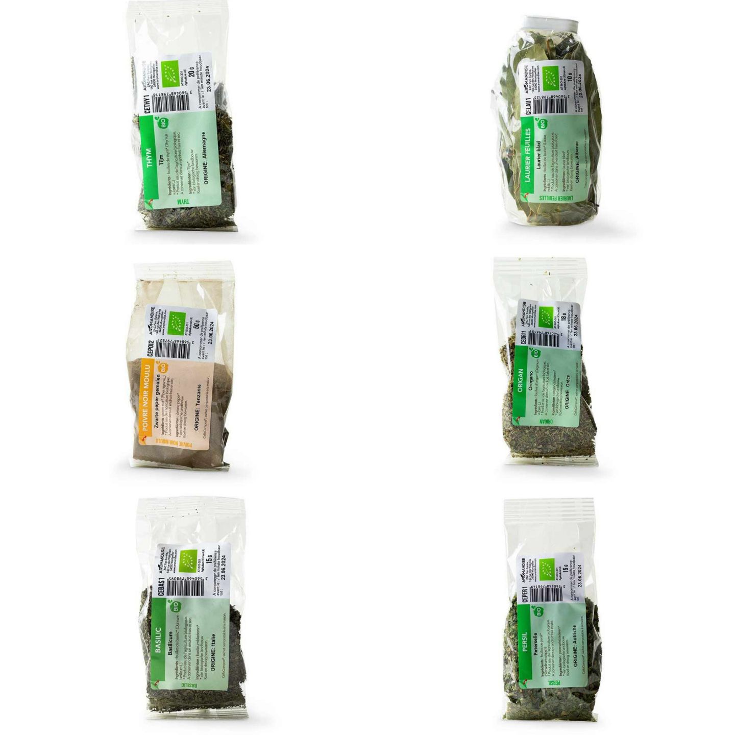 6 épices classiques de la cuisine méditerranéenne, conditionnées dans des sachets individuels afin que vous puissiez réaliser les mélanges que vous souhaitez.Thym moulu bio + Origan moulu bio + Basilic bio + Feuilles de laurier bio + Persil bio pour parfumer vos plats + Poivre noir moulu bio en sachet dégradable. Les épices CelloCompost de chez Aromandise : qu'est-ce que c'est ? Des épices emballées dans une protection transparente biosourcée à partir de cellules végétales, que vous pouvez composter depuis chez vous et biodégrader en 90 jours ! Dans chaque sachet d'épices, vous trouverez une étiquette en papier repositionnable à coller : une fois chez vous, transvasez les épices dans un récipient adapté, puis collez l'étiquette sur votre contenant. Rien de tel pour avoir accès d'un coup d'œil à la date de durabilité minimale et au nom de l'épice. Découvrez les accessoires à épices durables Aromandise tels que le flacon, l'entonnoir ou encore le moulin à épices.