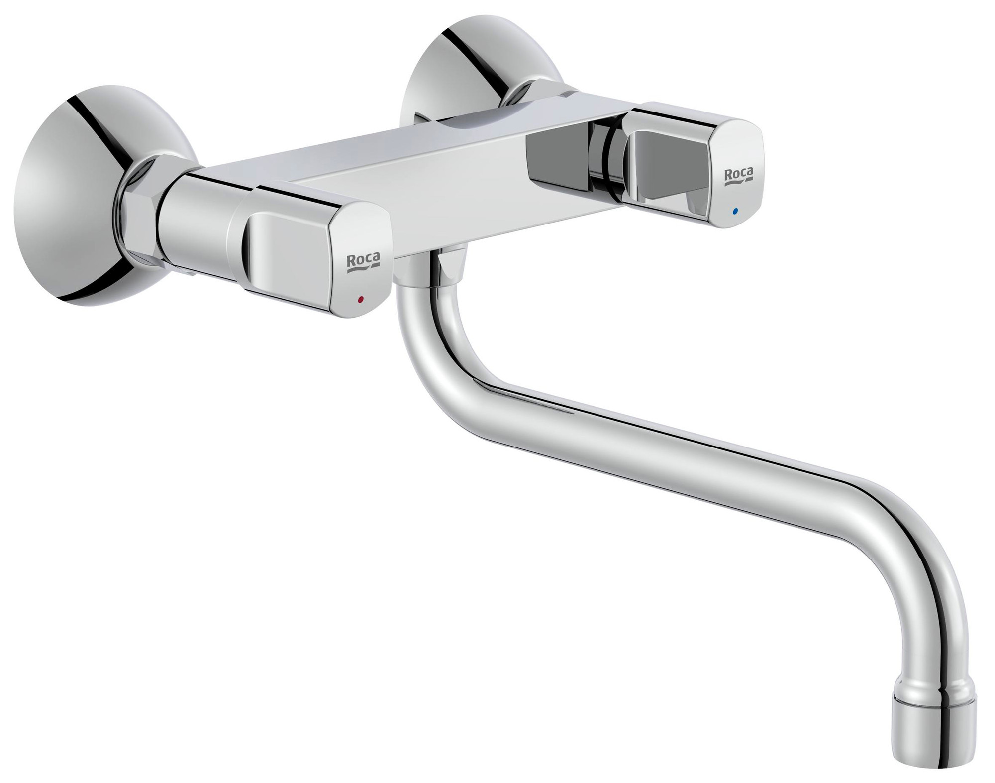 | Plus produit | Mélangeur mural à bec mobile 215 mm avec entraxe 150 mm, raccordements G1/2", finition chrome poli, deux poignées séparées avec indicateurs chaud/froid, rosaces murales Ø65 mm, logo Roca sur les poignées. |