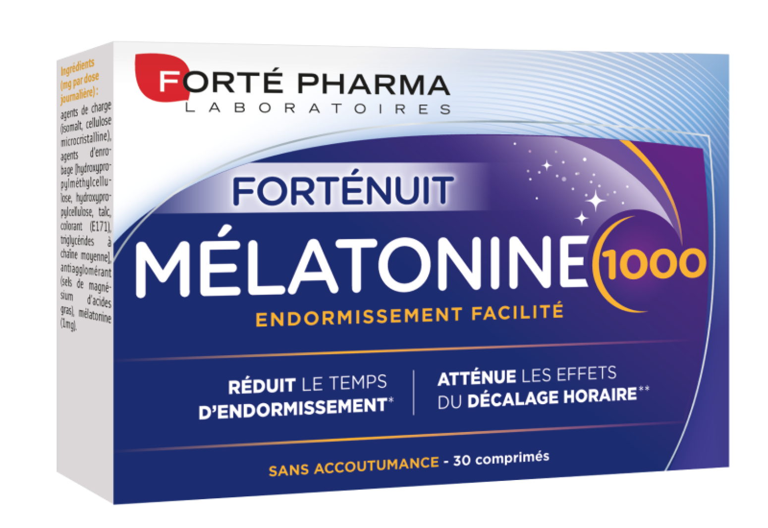 Voyage avec décalage horaire en perspective ? Vous éprouvez tout simplement des difficultés à vous endormir ? Pour vous aider, les Laboratoires Forté Pharma ont mis au point MÉLATONINE 1000. Ce complément alimentaire contient de la mélatonine, un actif qui contribue à réduire le temps d’endormissement* et à atténuer les effets du décalage horaire** (jet-lag).