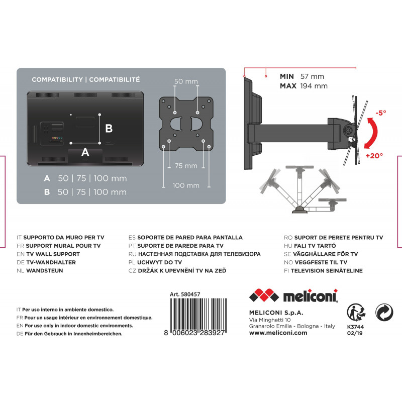 Meliconi FLATSTYLE ER 100. Capacité de charge maximale: 20 kg, Taille minimale de l'écran: 35,6 cm (14"), Taille maximale de l’écran: 63,5 cm (25"), Compatibilité interface de montage (min): 50 x 50 mm, Compatibilité interface de montage (max): 100 x 100 mm. Angle d'inclinaison: -5 - 20°, Plage de l'angle d'oscillation: -60 - 60°, Distance du mur (min): 5,7 cm, Distance du mur (max): 19,4 cm. Couleur du produit: Noir