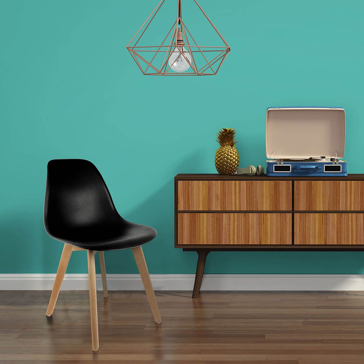 Piétement en bois massif naturel. Coque en polyéthylène coloris noir.