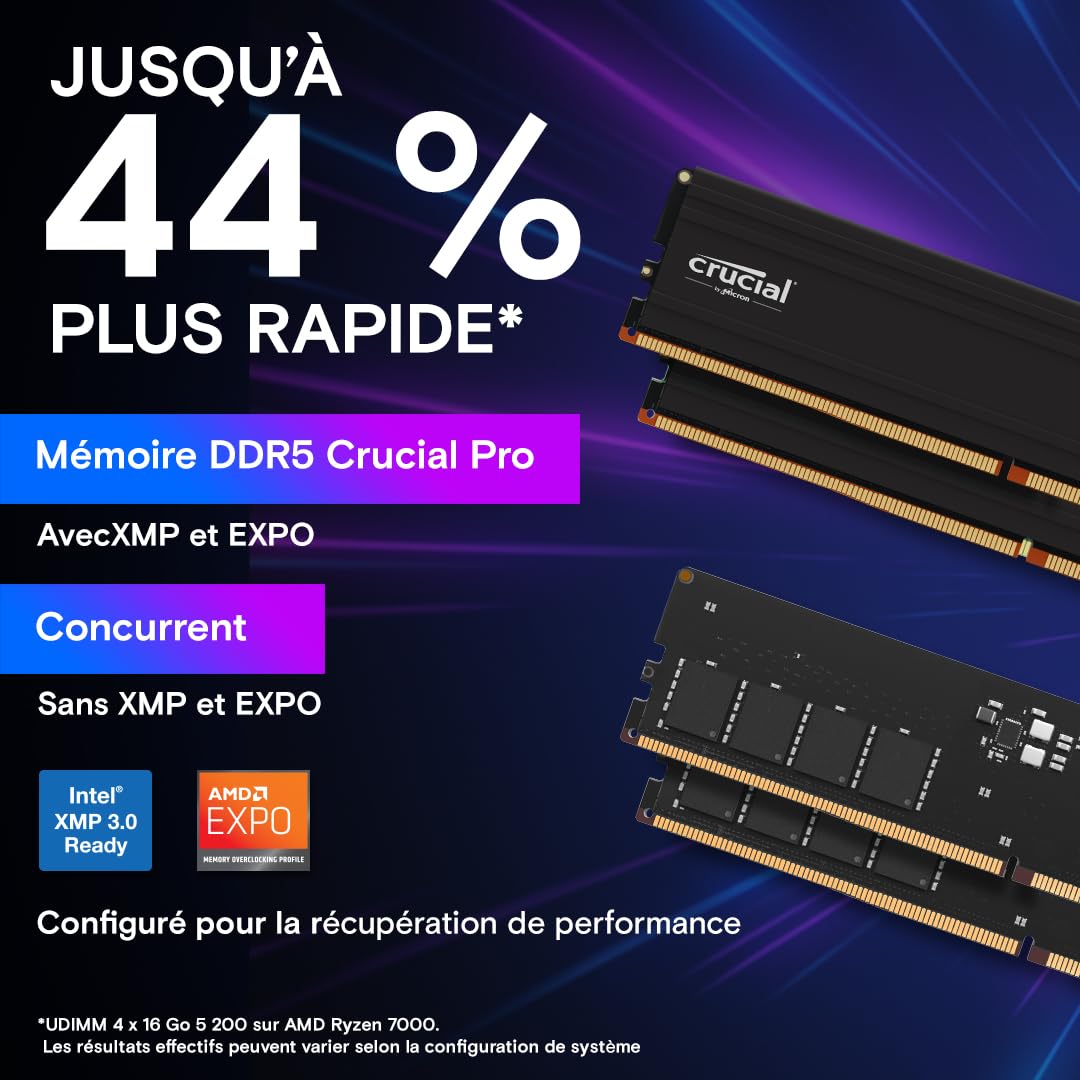 La référence CP2K32G56C46U5 correspond au kit Crucial 64 Go composé de deux (2) modules de mémoire DDR5 Pro 32 Go pour ordinateur de bureau fonctionnant a une vitesse de 5 600 MT/s et doté d'une latence CAS de 46. Il s'agit d'un module UDIMM conforme a la norme DDR5 UDIMM 288 broches. Il est compatible avec les systemes prenant en charge la mémoire UDIMM DDR5-5600.