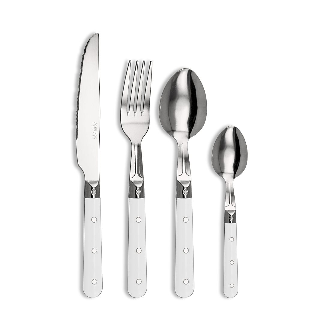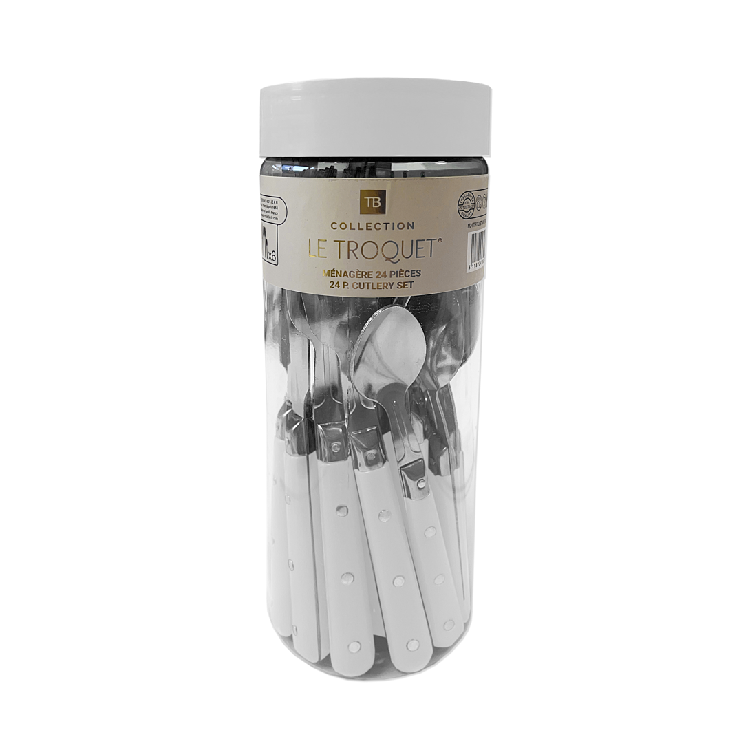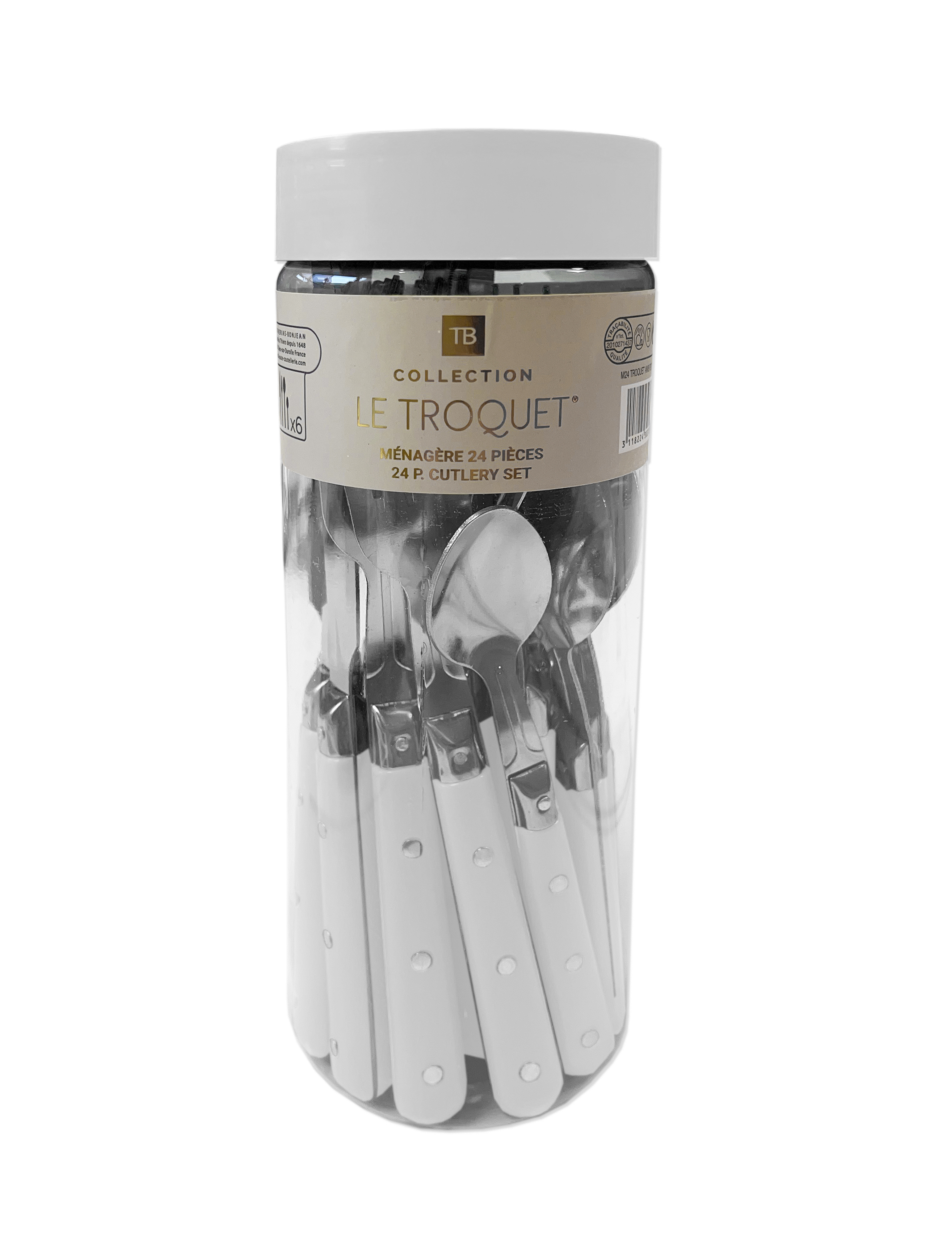 Ménagère 24 pièces TROQUET blanc en pot PET (6 couteaux - 6 fourchettes - 6 cuillères de table - 6 cuillères à café). Pleine soir, manche ABS, mitre inox, 3 rivets. Couteau steak.