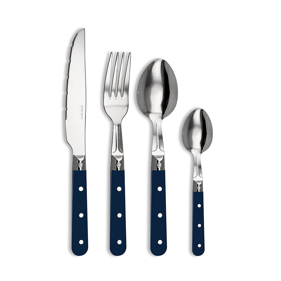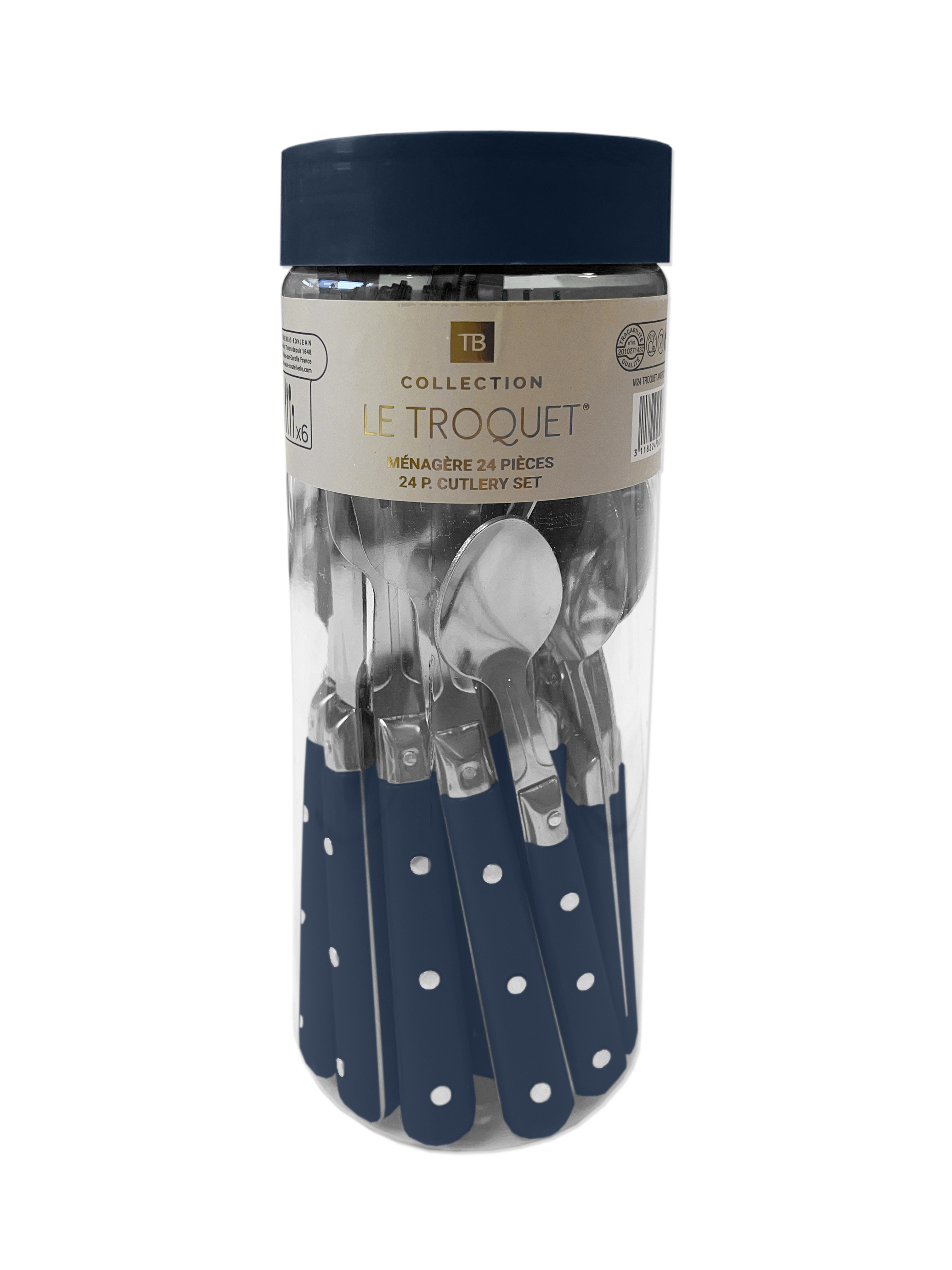 Ménagère 24 pièces TROQUET bleu marine en pot PET. Pleine soie, manche ABS, mitre inox, 3 rivets. Couteau à steak.