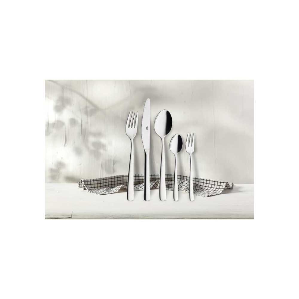 Comprend 6 fourchettes, 6 couteaux monoblocs lame micro-dentée, 6 cuillères à soupe, 6 cuillères à café et 6 fourchettes à gâteau.