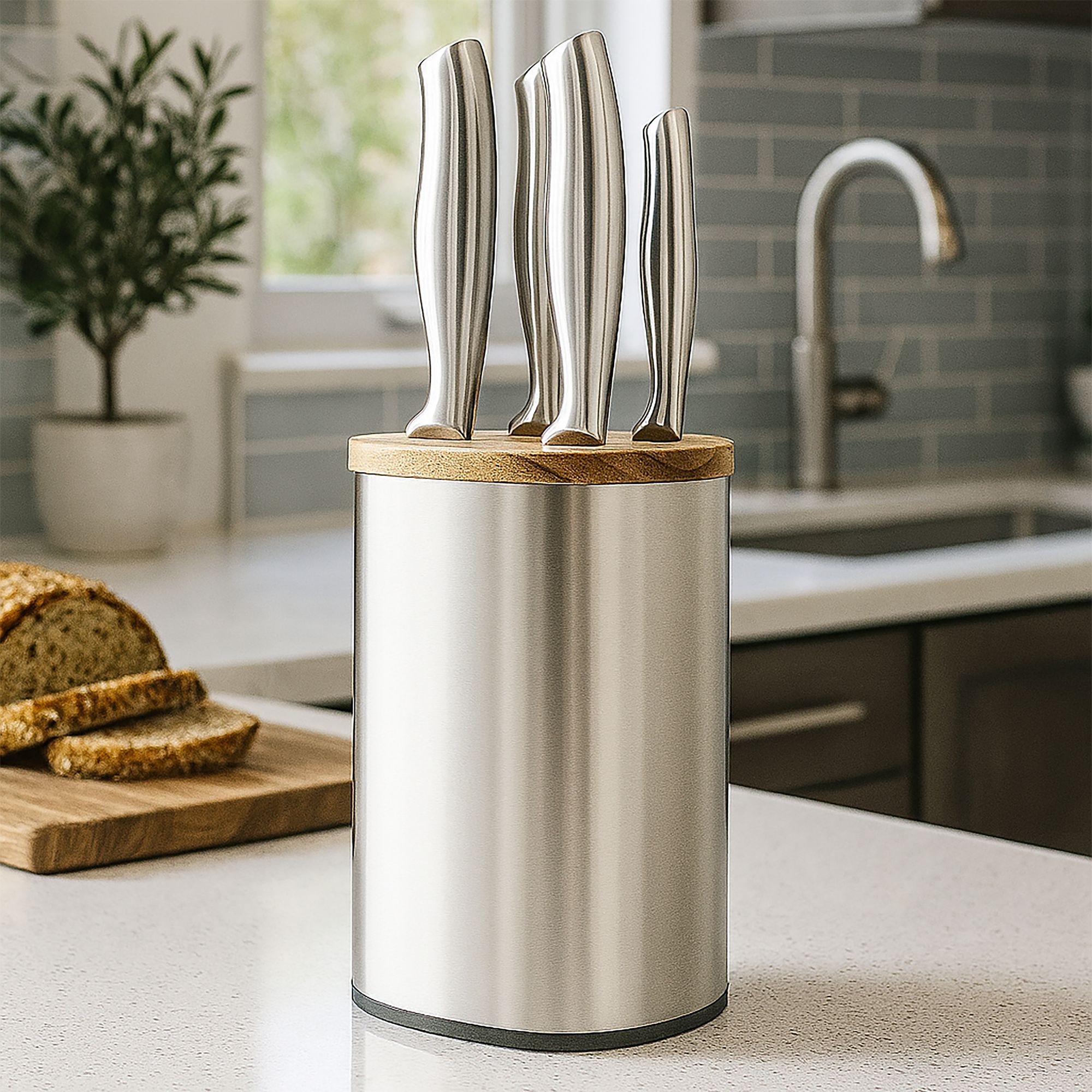 Notre bloc à couteaux est conçu pour allier fonctionnalité, durabilité et élégance, c'est un ajout incontournable à votre cuisine. Cet ensemble est complet et il est idéal pour hâcher, trancher, couper en dés et couper votre viande/légumes/fruits... Le set est composé des couteaux suivants : -1 couteau à pain 20.5cm -1 couteau chef 20.5cm -1 couteau à trancher 20.5cm -1 couteau utilitaire 10cm -1 couteau office 7.5cmFabriqué en acier inoxydable conçu pour durerSûr et pratique pour ranger vos couteaux sans tiroir emcombréAvec des fentes spécialement conçues pour chaque couteau !Nettoyer à l'aide d'un chiffon en microfibre humide puis essuyer
